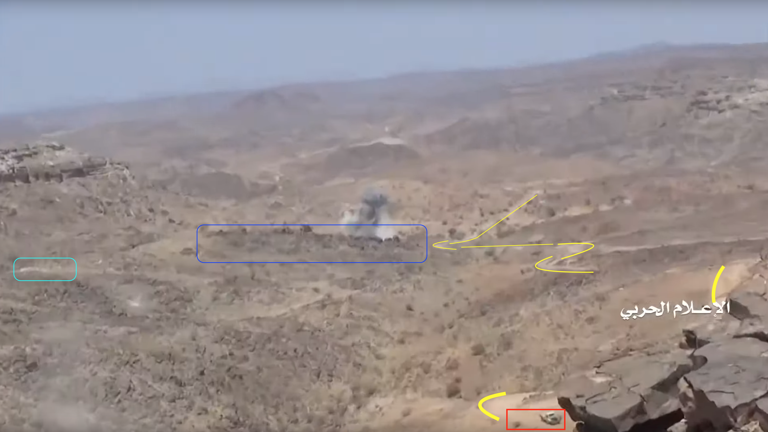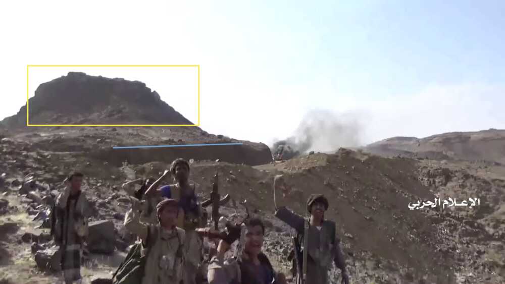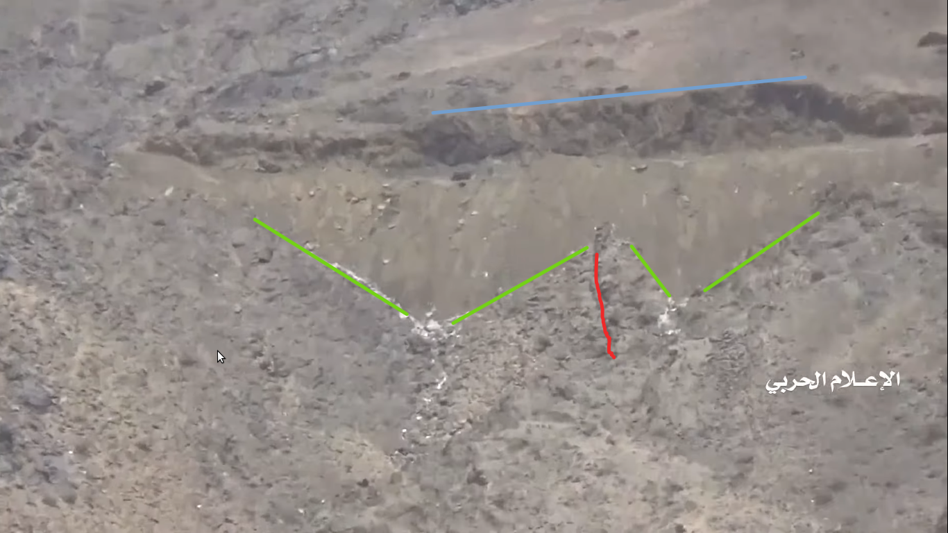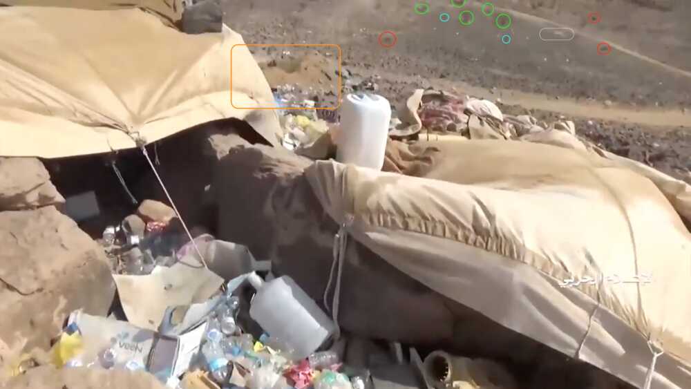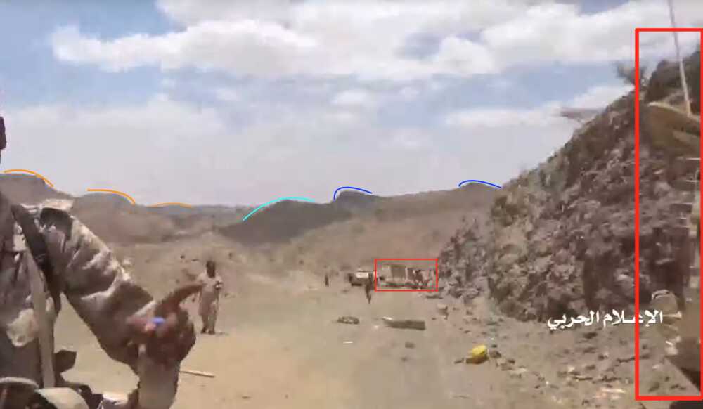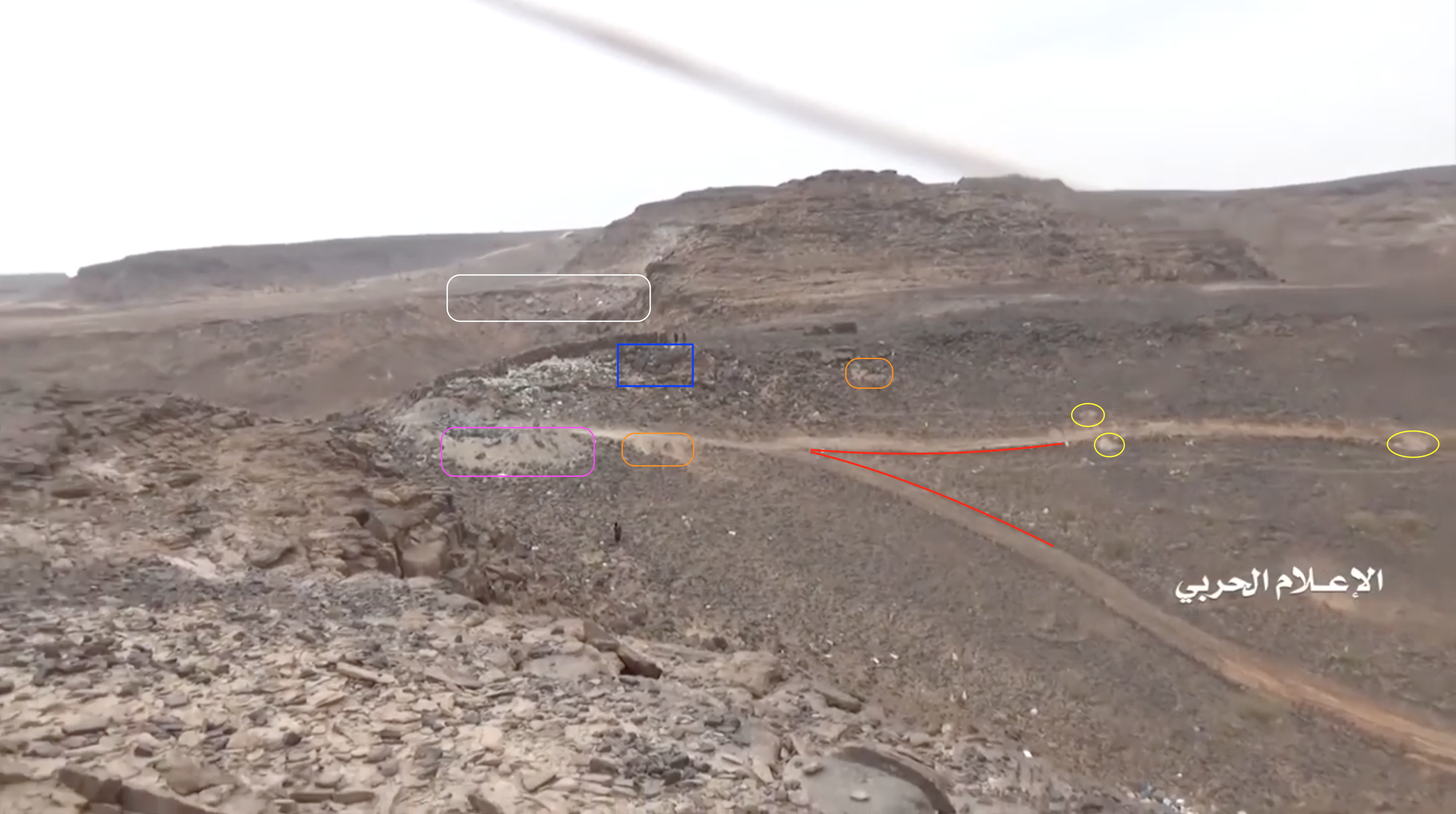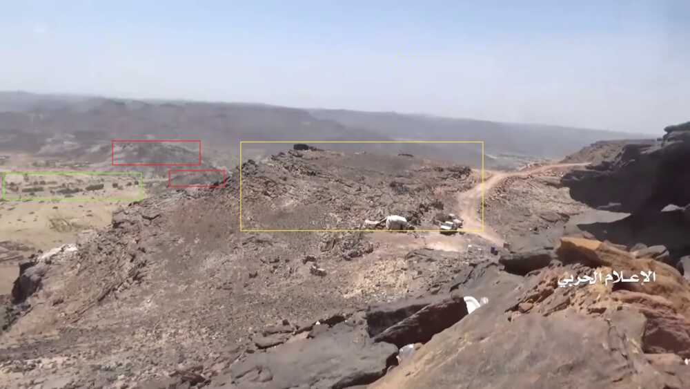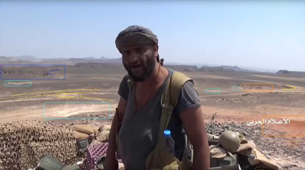 Later in de video veroveren de Houthi rebellen de positie en beginnen ze te filmen vanuit de positie. Op 26:19 kunnen verschillende elementen in de vlakte achter de positie geïdentificeerd worden. Links vanaf de top: op een afstand een boogvormige rotswand (blauw), een lichtgekleurd gebied op de grond (lichtblauw), een patroon van drie sporen (geel) en een tweede lichtkleurige plek. Rechts twee witte punten (lichtblauw) met dezelfde richting als het naar links draaiende spoor (geel), een strook lossere grond (oranje) en daaronder in de voorgrond een gebied met donkere, rode bodem (oranje).