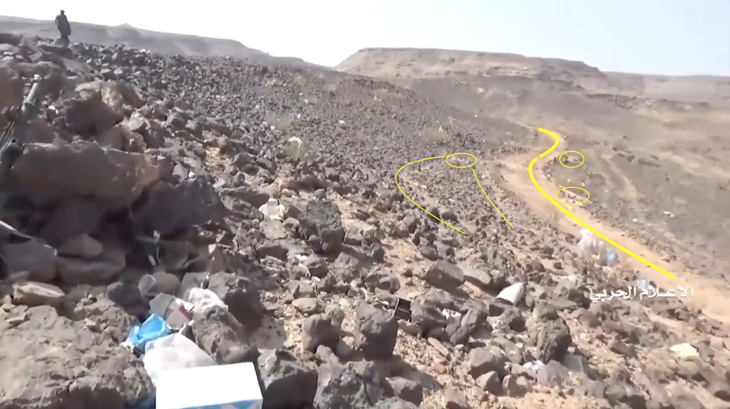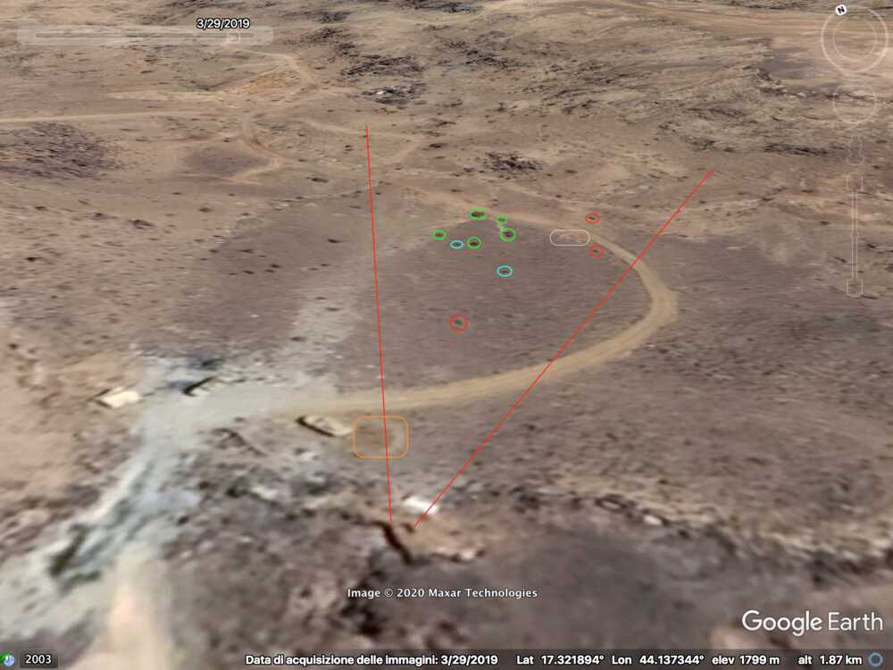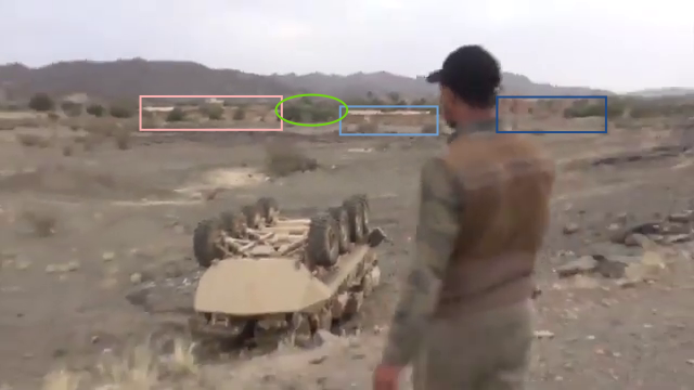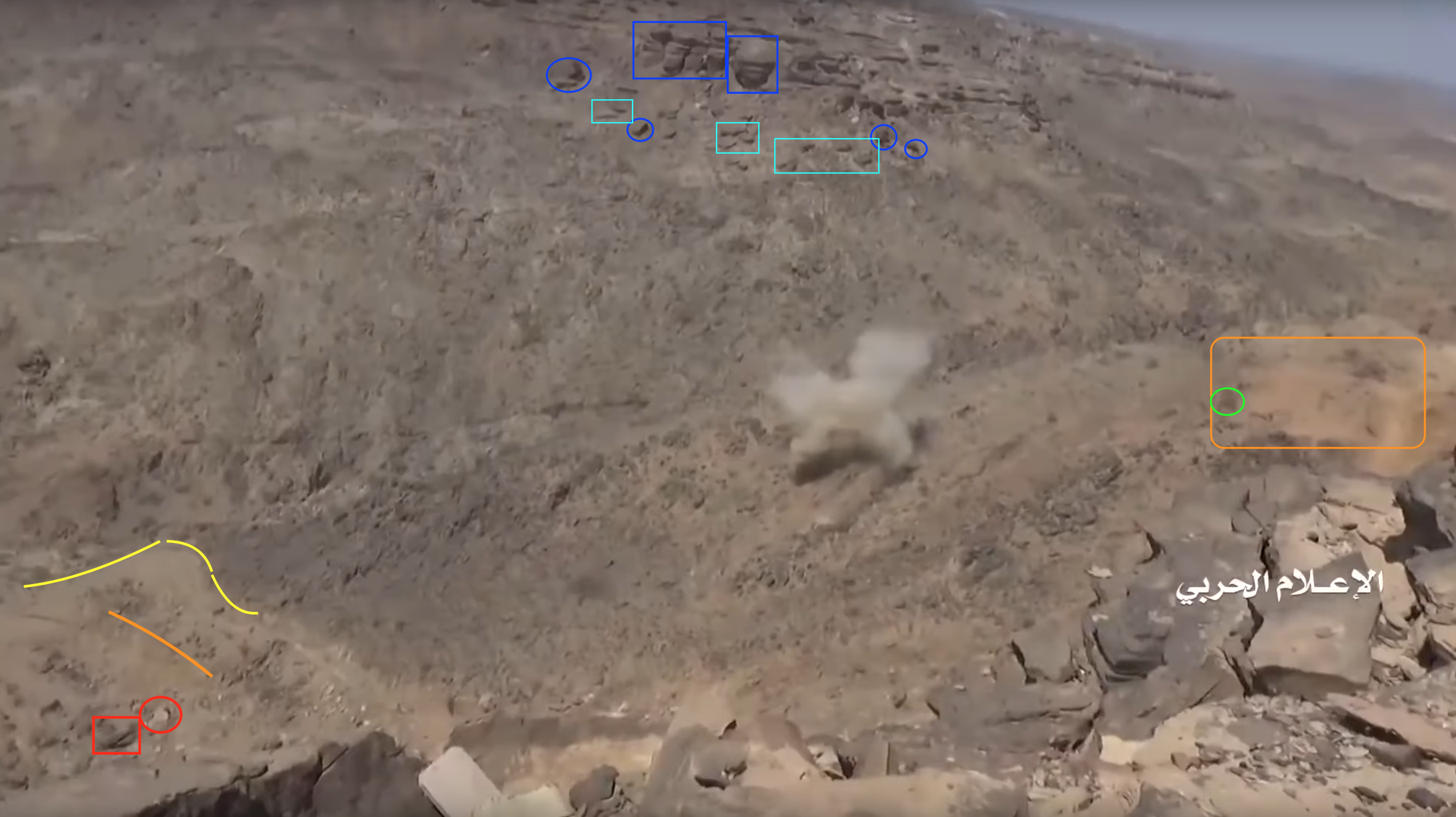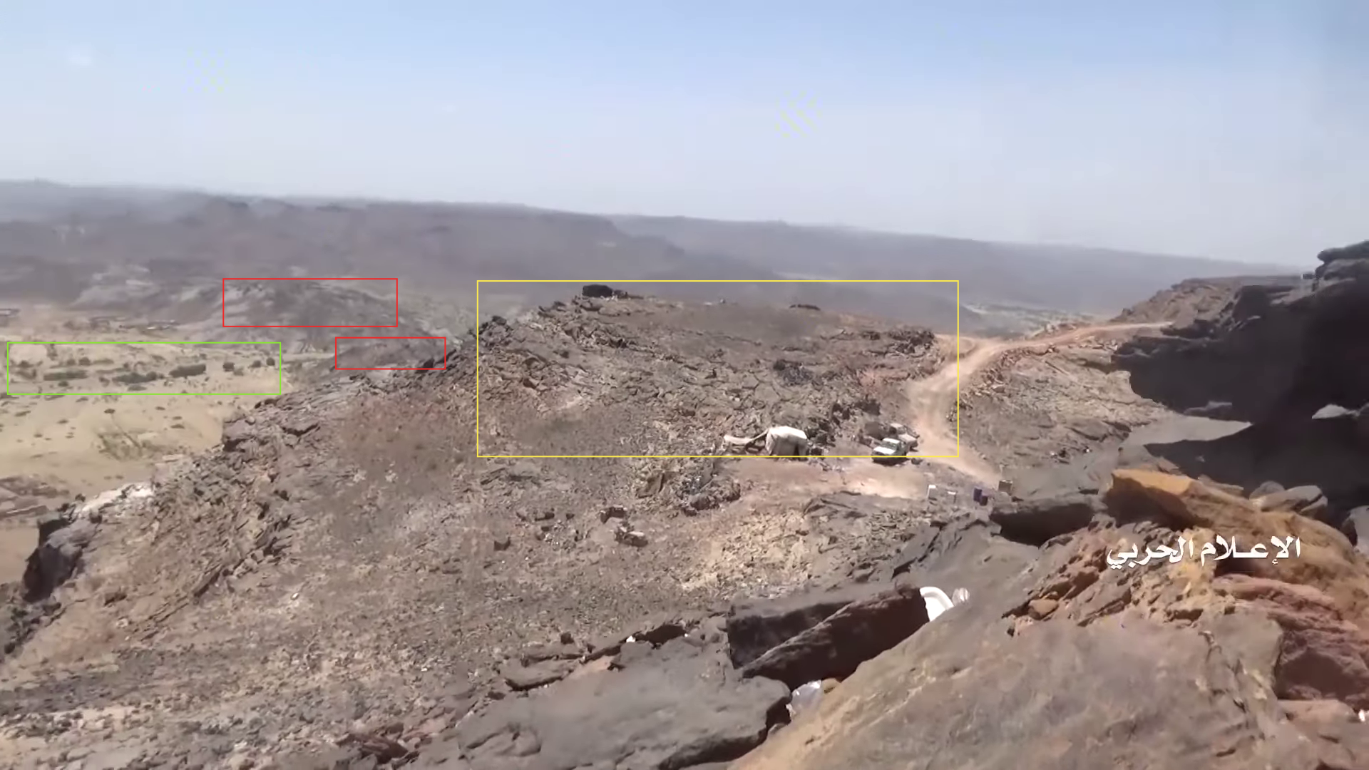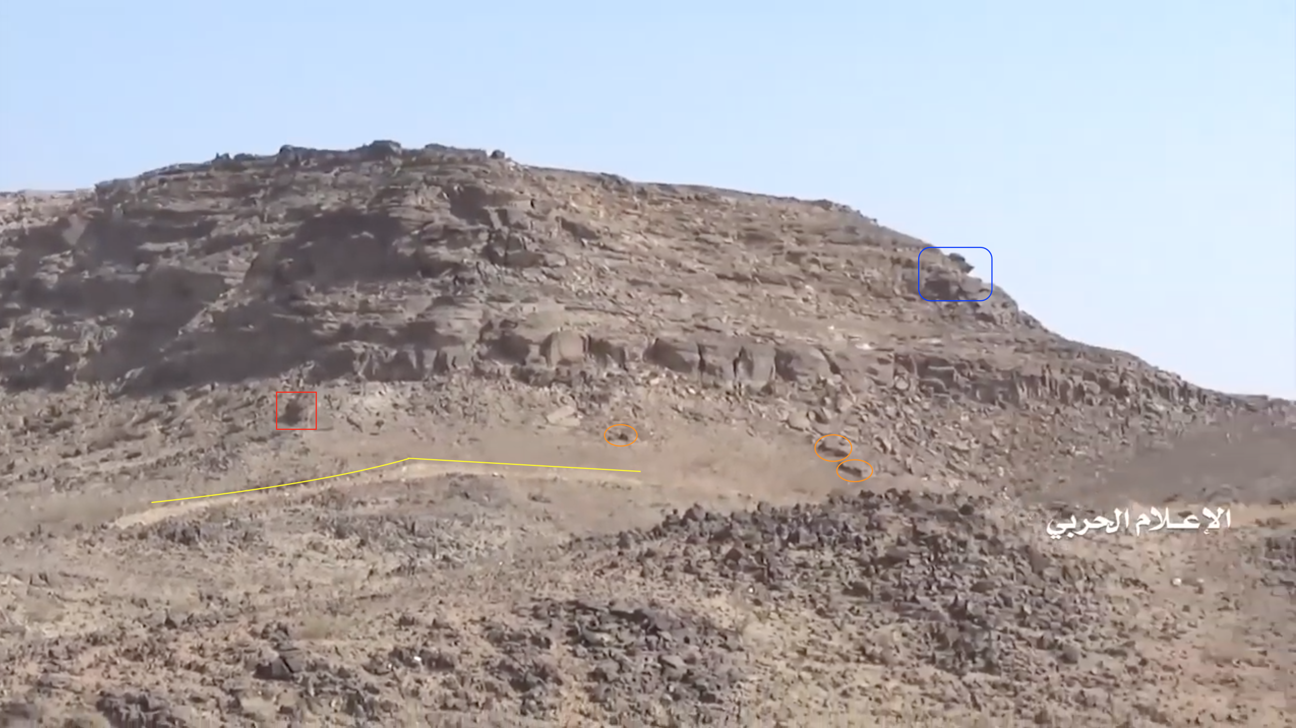Later in de video veroveren de Houthi rebellen de positie en beginnen ze te filmen vanuit de positie. Op 26:19 kunnen verschillende elementen in de vlakte achter de positie geïdentificeerd worden. Links vanaf de top: op een afstand een boogvormige rotswand (blauw), een lichtgekleurd gebied op de grond (lichtblauw), een patroon van drie sporen (geel) en een tweede lichtkleurige plek. Rechts twee witte punten (lichtblauw) met dezelfde richting als het naar links draaiende spoor (geel), een strook lossere grond (oranje) en daaronder in de voorgrond een gebied met donkere, rode bodem (oranje).
