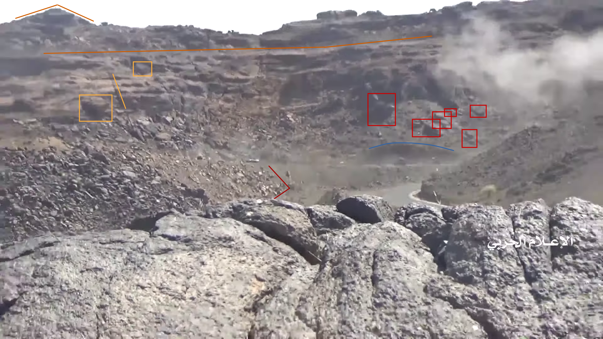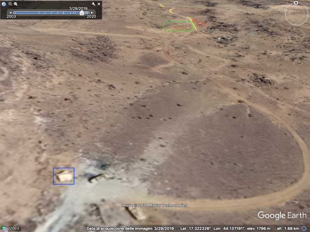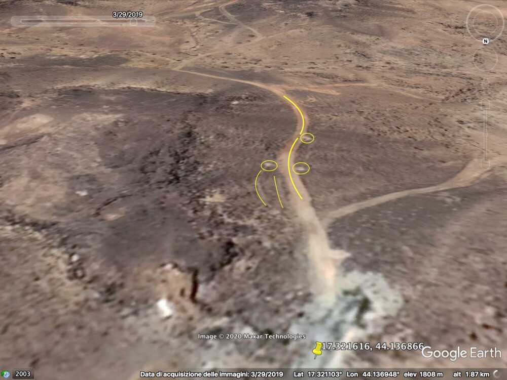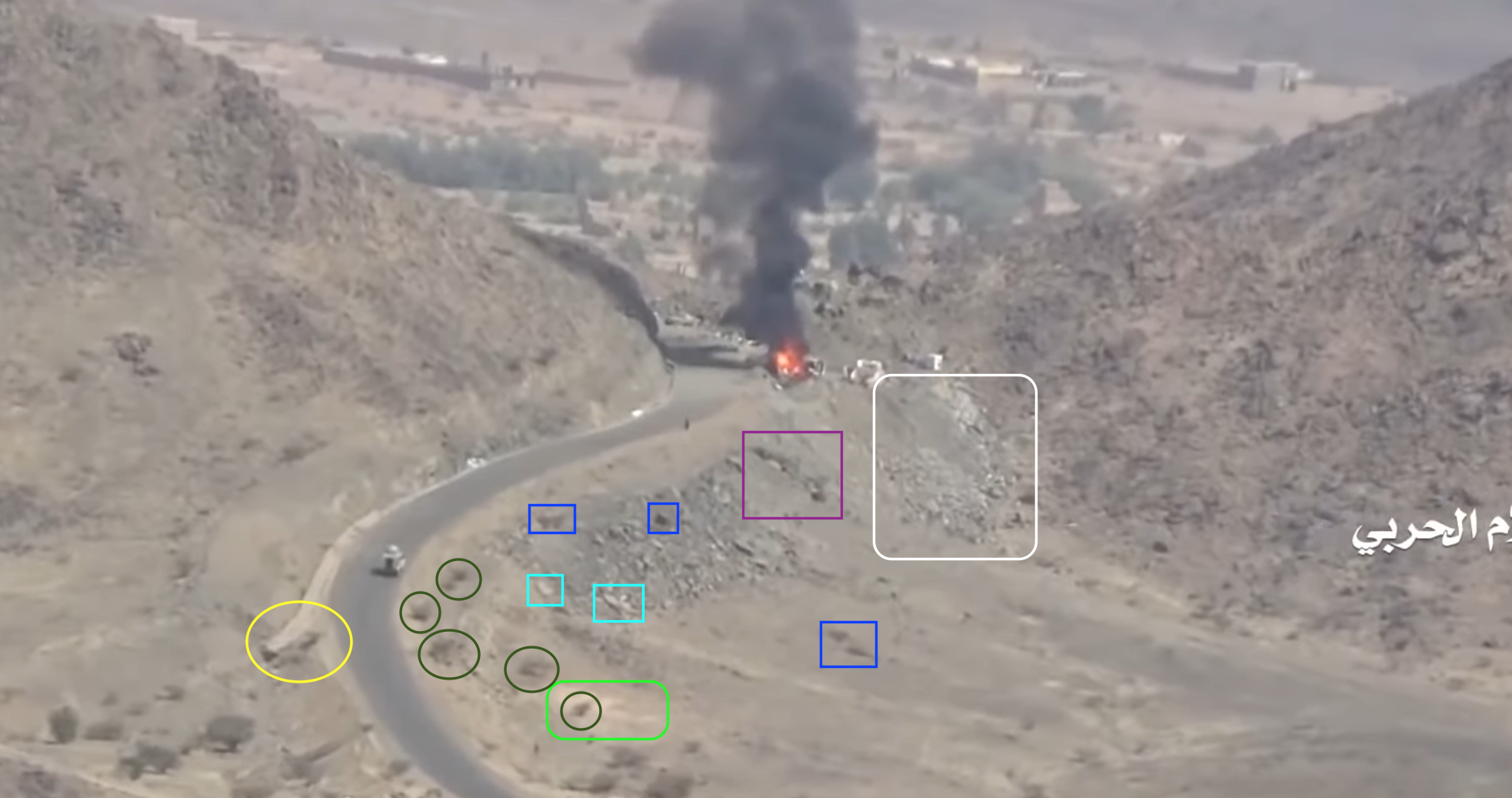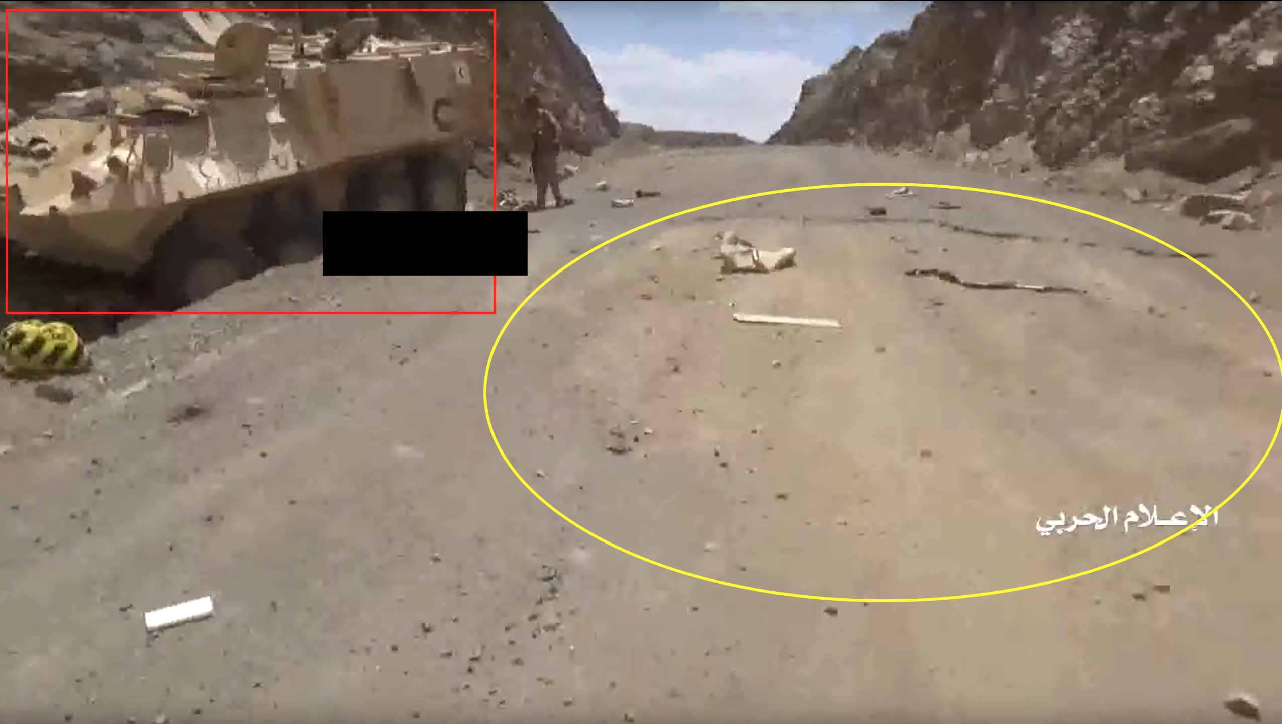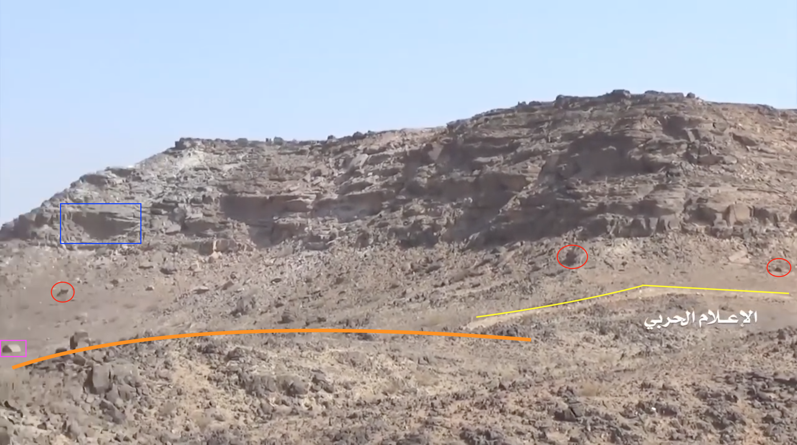 Later in de video veroveren de Houthi rebellen de positie en beginnen ze te filmen vanuit de positie. Op 26:19 kunnen verschillende elementen in de vlakte achter de positie geïdentificeerd worden. Links vanaf de top: op een afstand een boogvormige rotswand (blauw), een lichtgekleurd gebied op de grond (lichtblauw), een patroon van drie sporen (geel) en een tweede lichtkleurige plek. Rechts twee witte punten (lichtblauw) met dezelfde richting als het naar links draaiende spoor (geel), een strook lossere grond (oranje) en daaronder in de voorgrond een gebied met donkere, rode bodem (oranje).