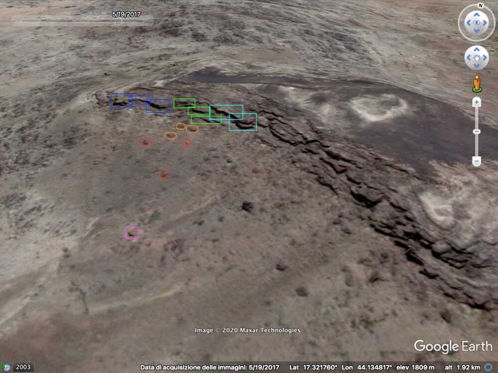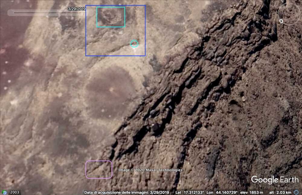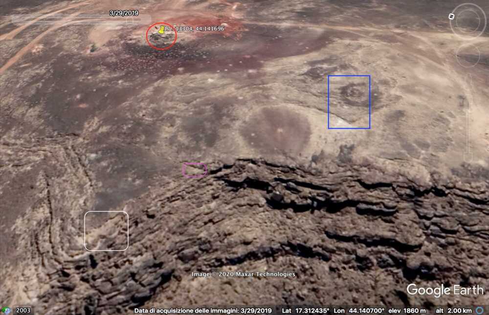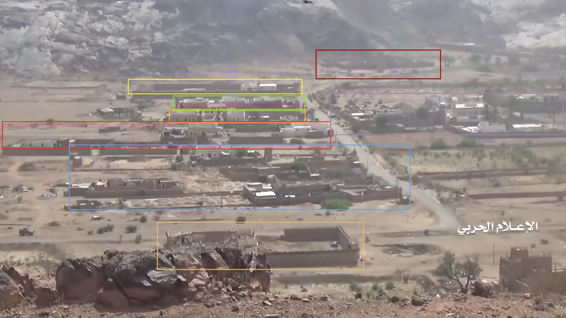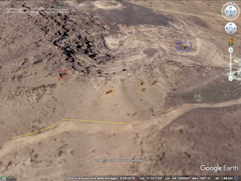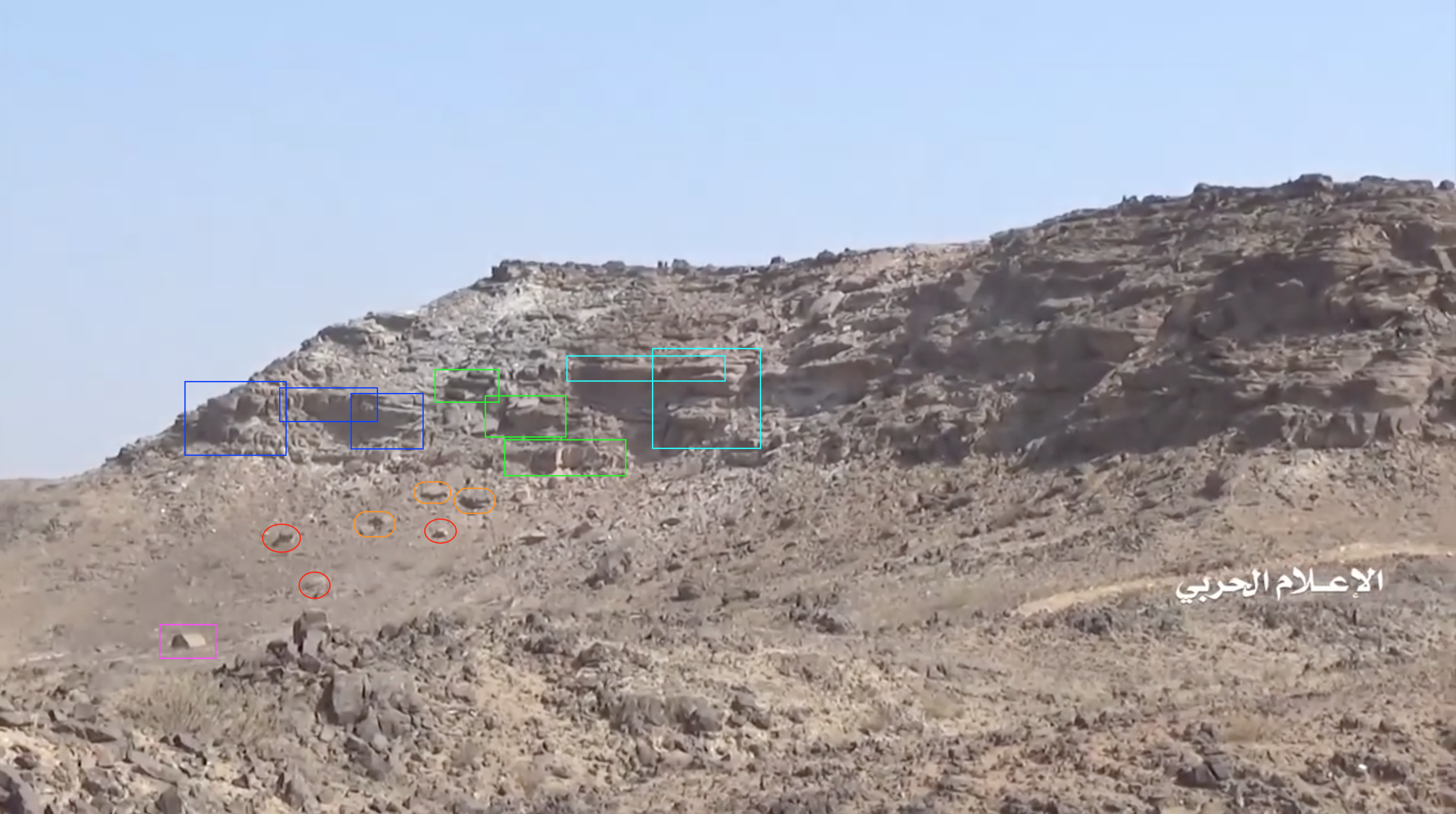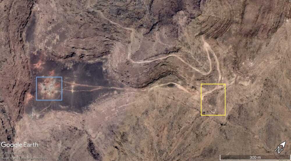 Later in de video veroveren de Houthi rebellen de positie en beginnen ze te filmen vanuit de positie. Op 26:19 kunnen verschillende elementen in de vlakte achter de positie geïdentificeerd worden. Links vanaf de top: op een afstand een boogvormige rotswand (blauw), een lichtgekleurd gebied op de grond (lichtblauw), een patroon van drie sporen (geel) en een tweede lichtkleurige plek. Rechts twee witte punten (lichtblauw) met dezelfde richting als het naar links draaiende spoor (geel), een strook lossere grond (oranje) en daaronder in de voorgrond een gebied met donkere, rode bodem (oranje).