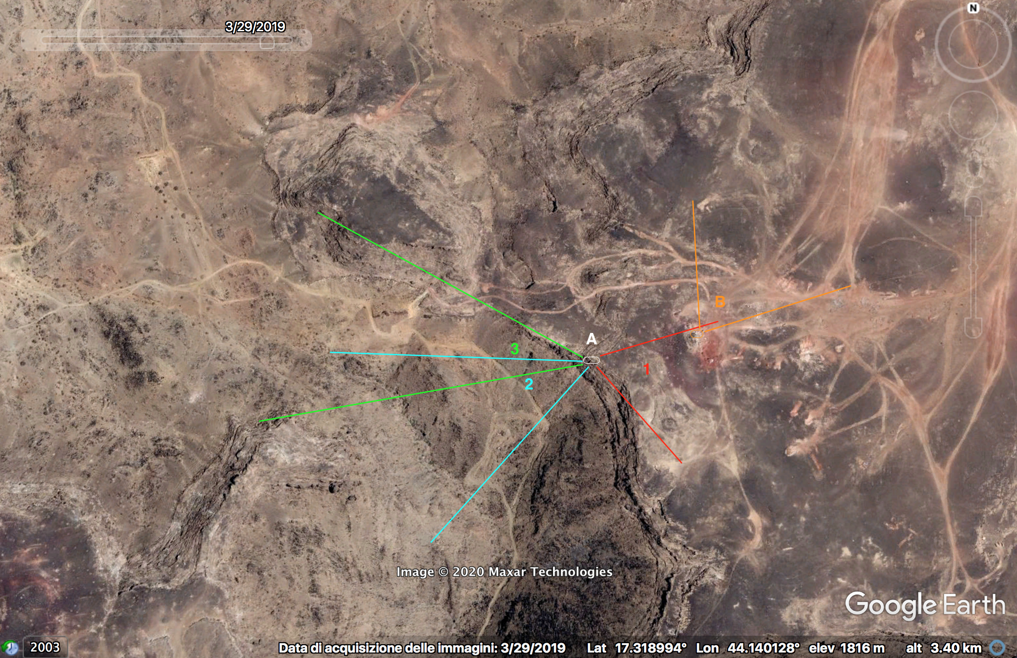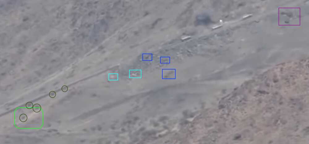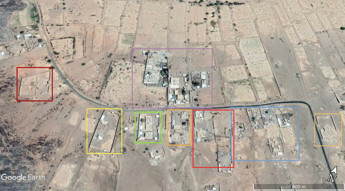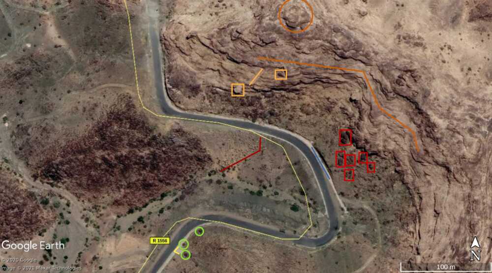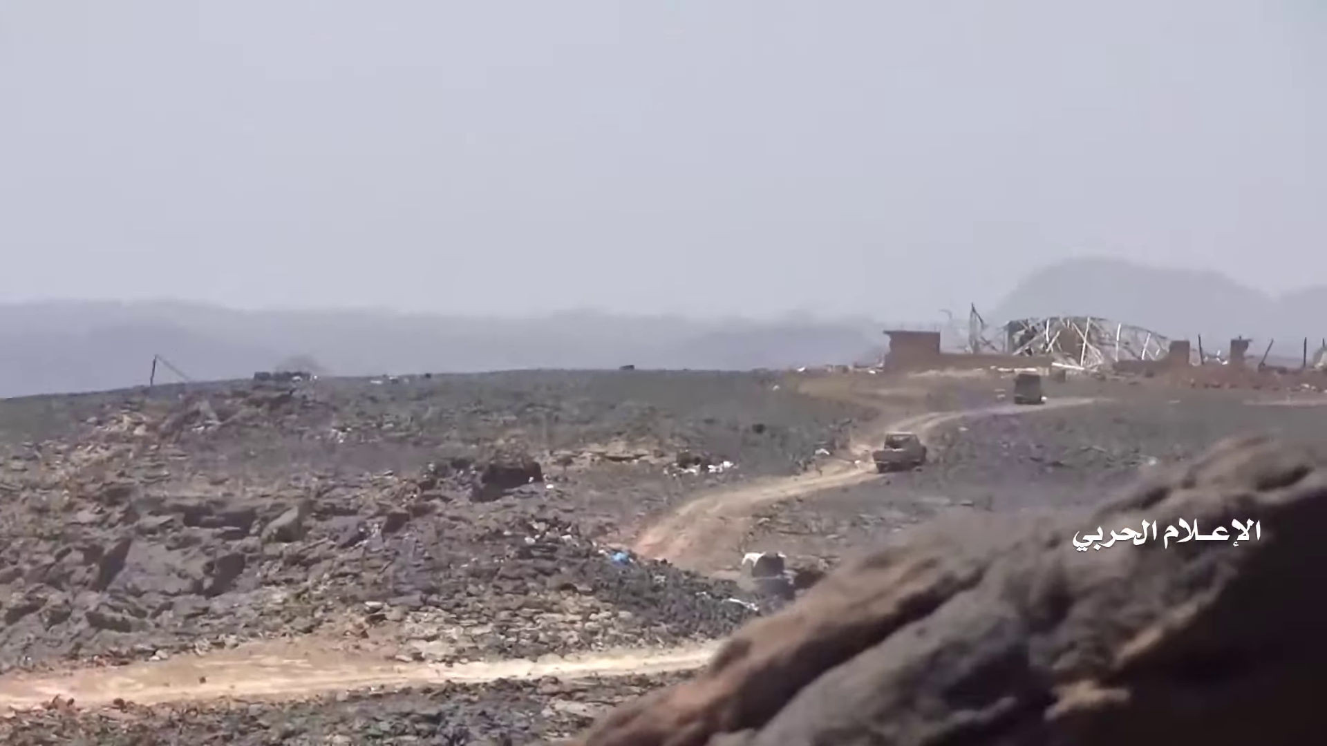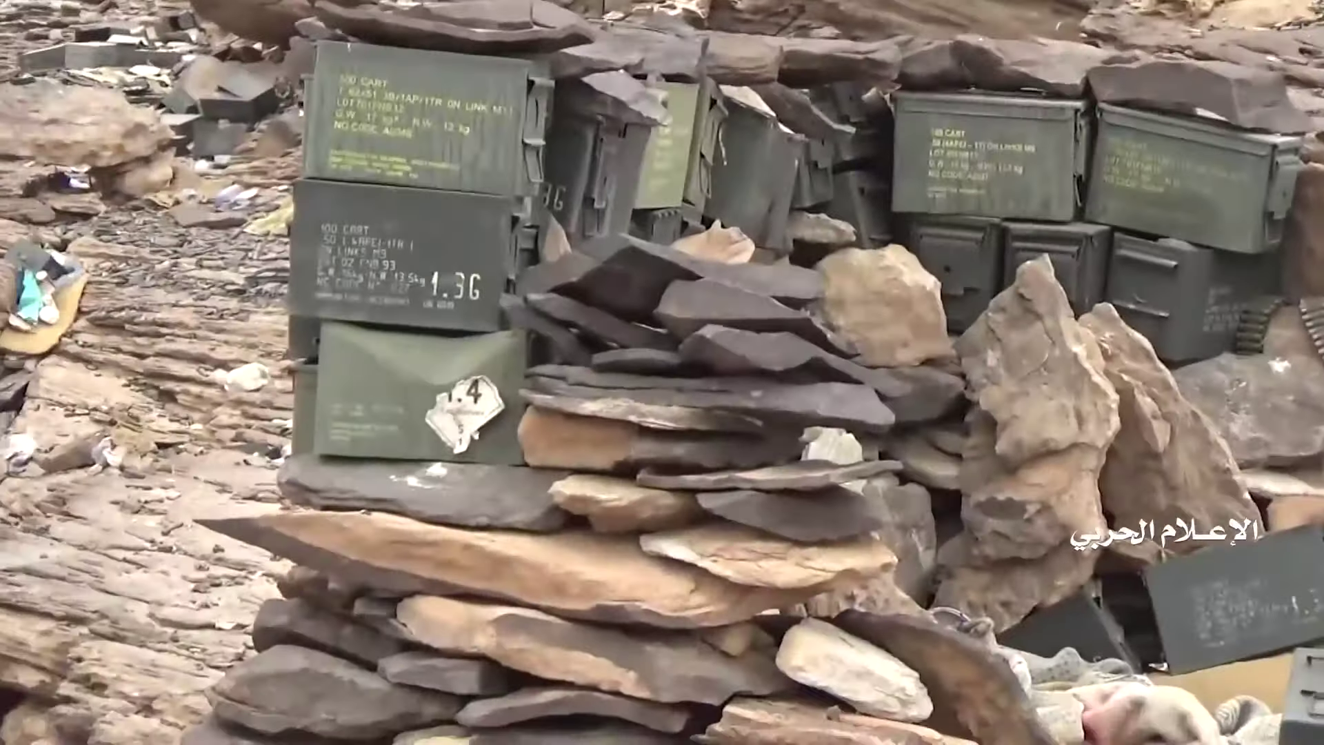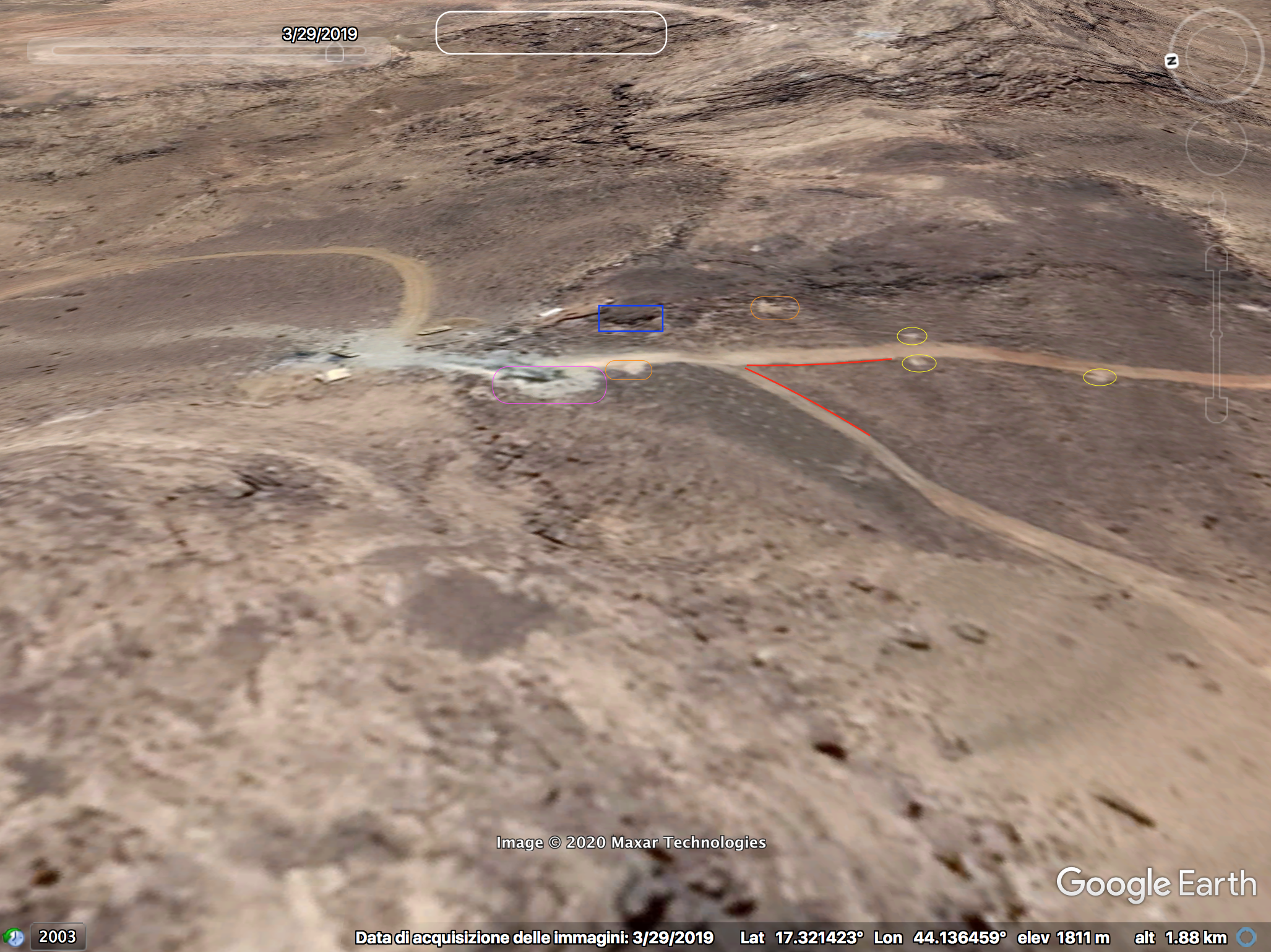 Later in de video veroveren de Houthi rebellen de positie en beginnen ze te filmen vanuit de positie. Op 26:19 kunnen verschillende elementen in de vlakte achter de positie geïdentificeerd worden. Links vanaf de top: op een afstand een boogvormige rotswand (blauw), een lichtgekleurd gebied op de grond (lichtblauw), een patroon van drie sporen (geel) en een tweede lichtkleurige plek. Rechts twee witte punten (lichtblauw) met dezelfde richting als het naar links draaiende spoor (geel), een strook lossere grond (oranje) en daaronder in de voorgrond een gebied met donkere, rode bodem (oranje).