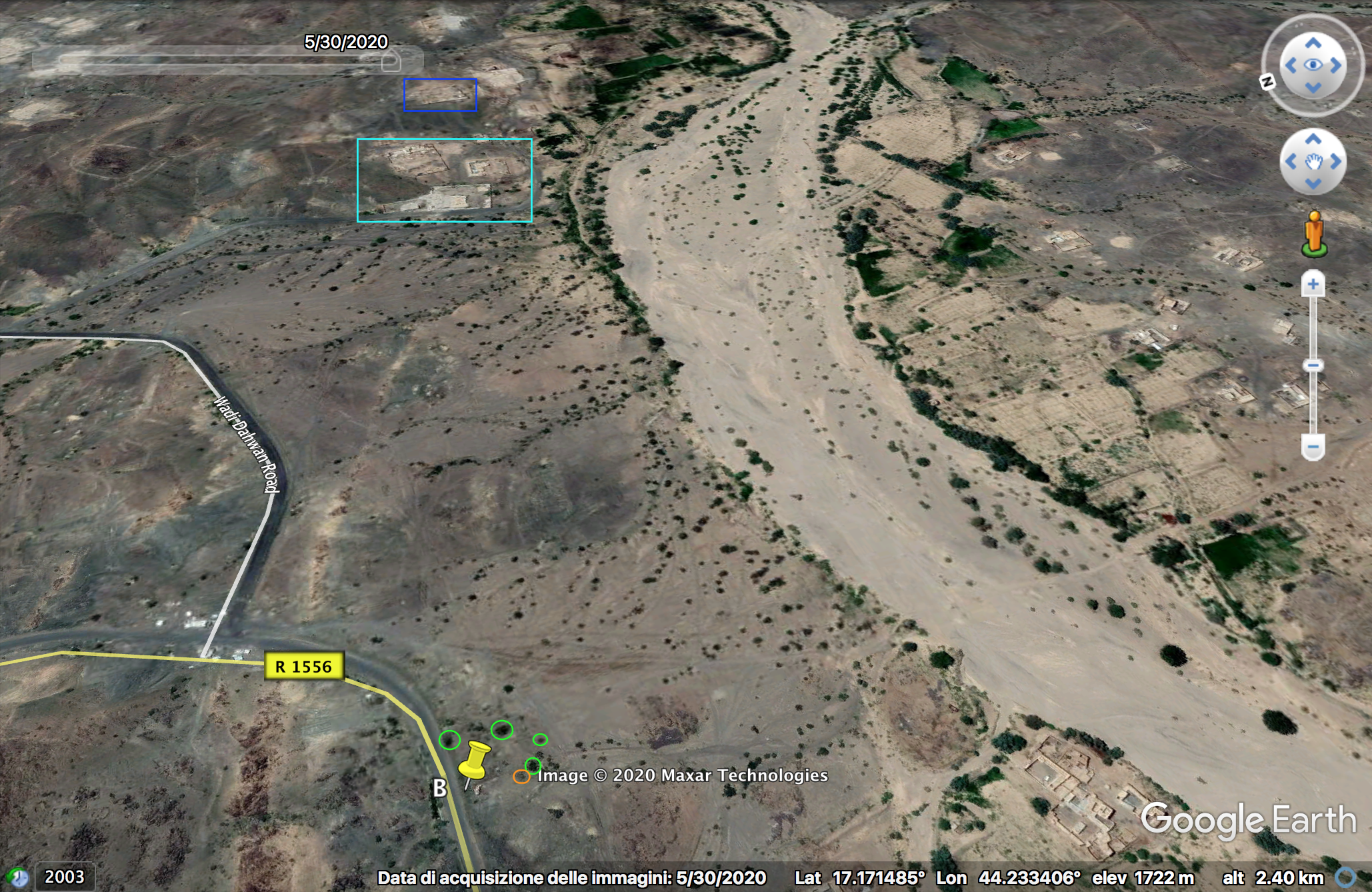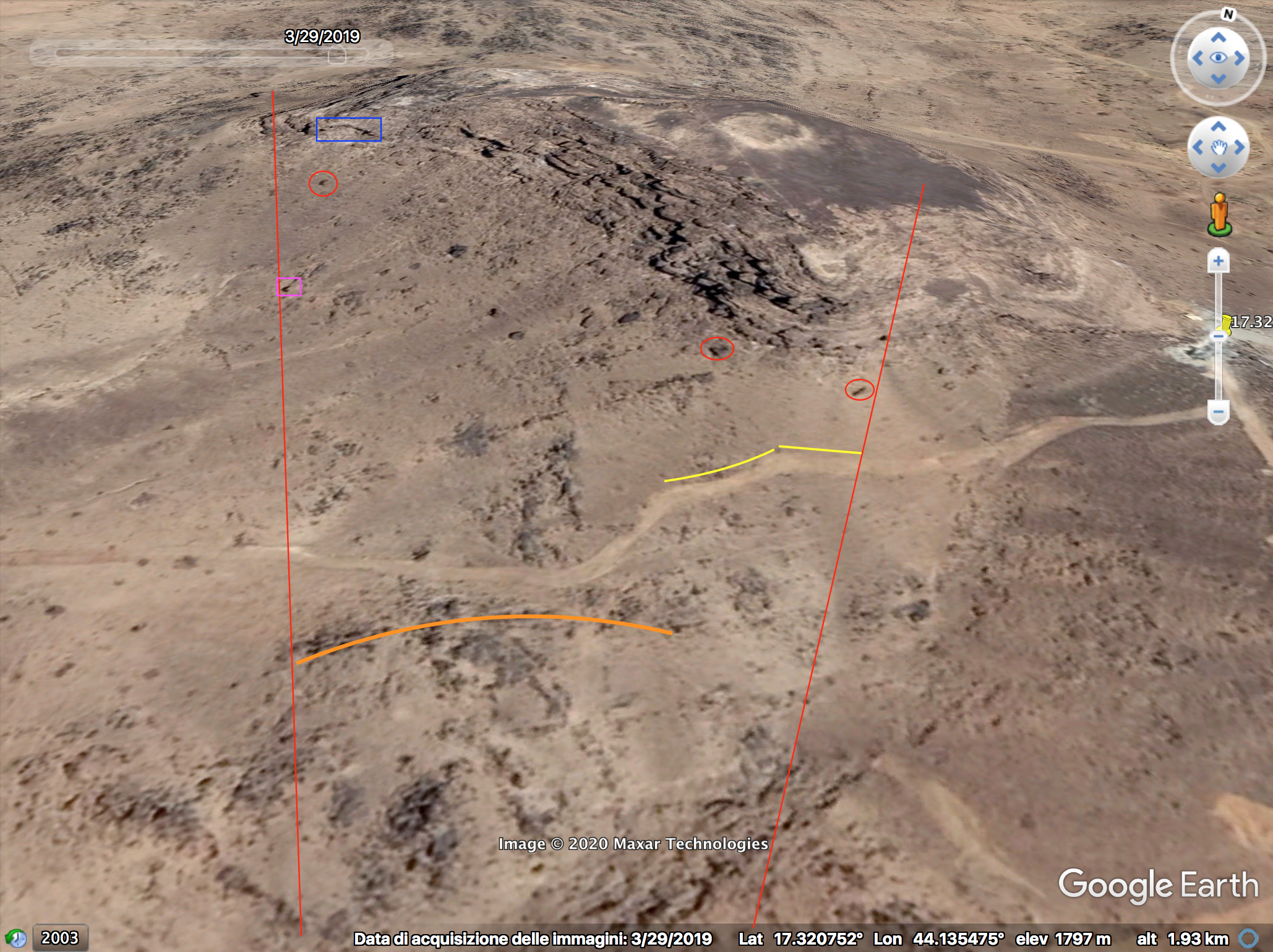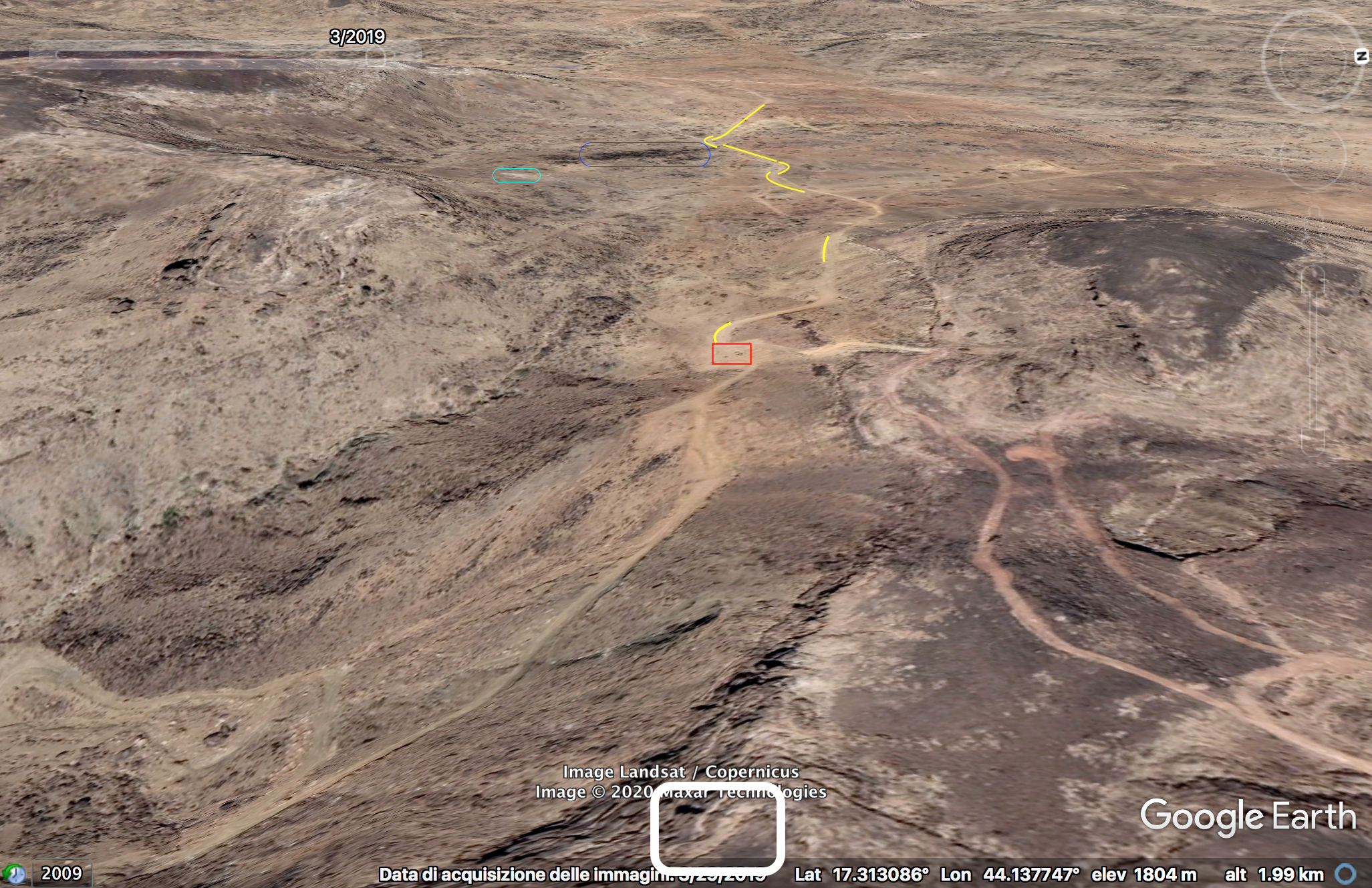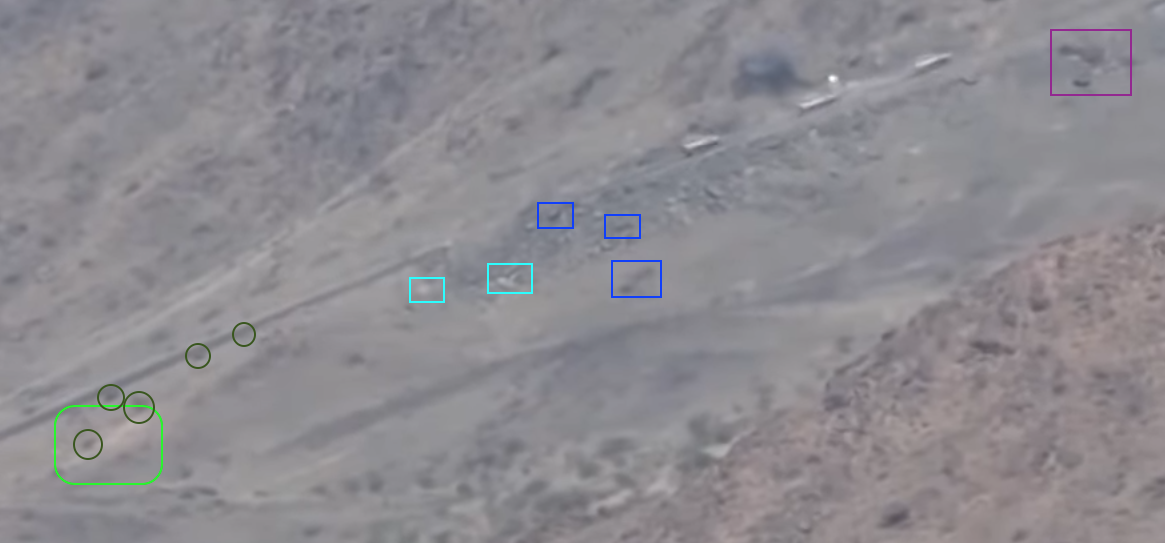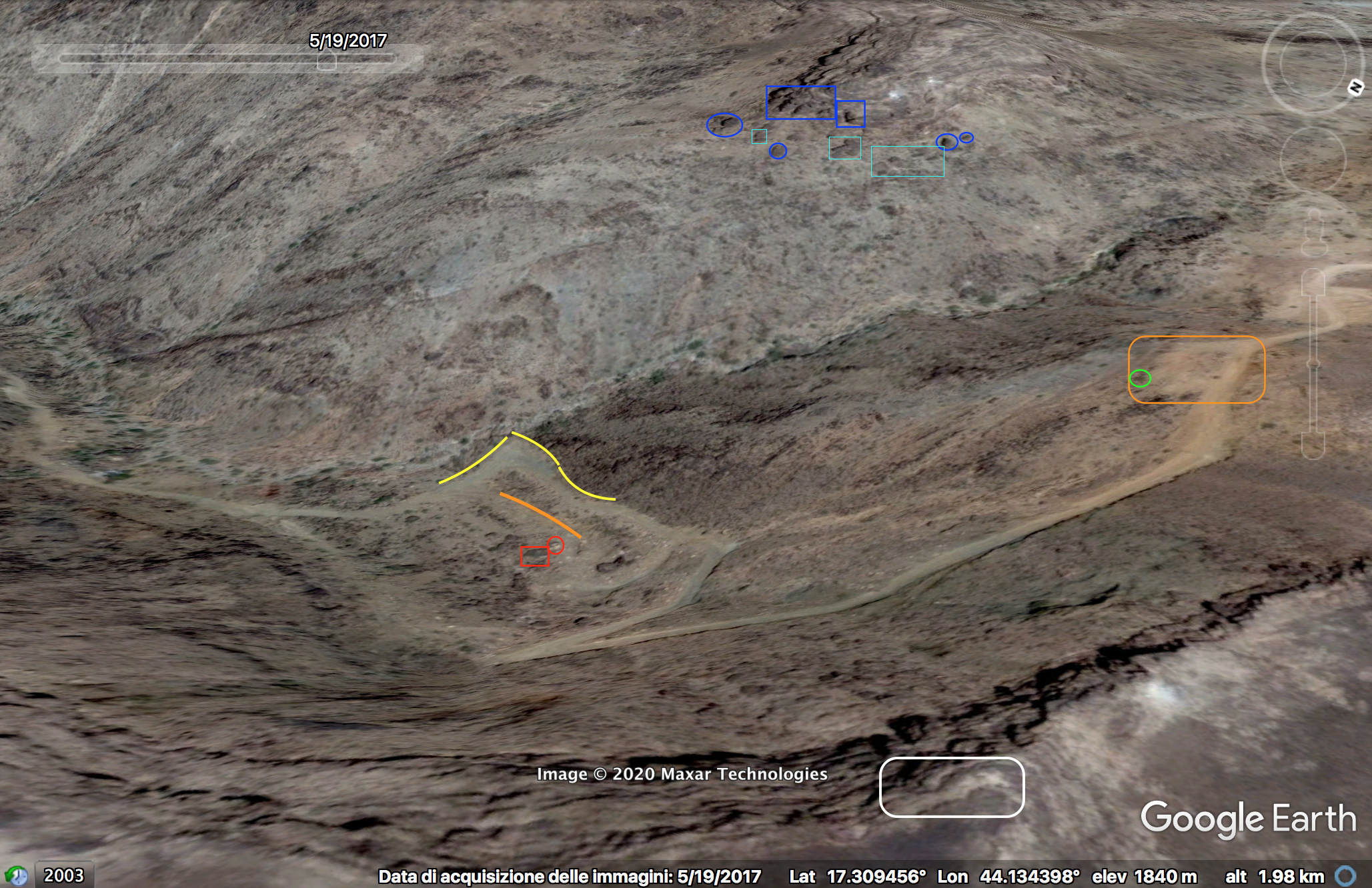 Later in de video veroveren de Houthi rebellen de positie en beginnen ze te filmen vanuit de positie. Op 26:19 kunnen verschillende elementen in de vlakte achter de positie geïdentificeerd worden. Links vanaf de top: op een afstand een boogvormige rotswand (blauw), een lichtgekleurd gebied op de grond (lichtblauw), een patroon van drie sporen (geel) en een tweede lichtkleurige plek. Rechts twee witte punten (lichtblauw) met dezelfde richting als het naar links draaiende spoor (geel), een strook lossere grond (oranje) en daaronder in de voorgrond een gebied met donkere, rode bodem (oranje).