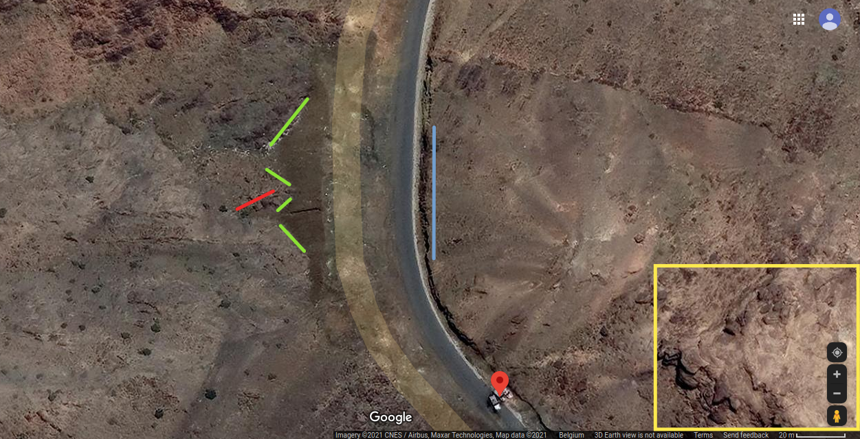 Voor de rechterzijde is op 32:36 het voertuigspoor (geel) en de 2 rotsen daarboven gebruikt als referentie. De linkse rots (rood) is aangeduid als in het globale beeld voor perspectief A. Voor de tweede rots is een andere kleur gebruikt omdat dit een specifiek patroon vormt met de twee rotsen rechts ervan (oranje). Bijkomend kan de rotspunt op de helling (blauw) op de satellietfoto teruggevonden worden opdat dit een specifieke schaduw creëert op de wand.