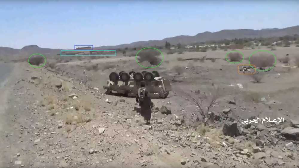 Deze door de Houthi gemaakte reportage toont van 14:49 tot 18:31 de vernietiging van 3 M-ATVs in een hinderlaag. De wrakken van deze M-ATVs kunnen nog steeds gevonden worden op de Google maps satellietbeelden en waren nog niet aanwezig op de beelden gemaakt op 21 july 2019. Het videofragment start met een beeld van de weg en zoomt in op de latere hinderlaagplek.