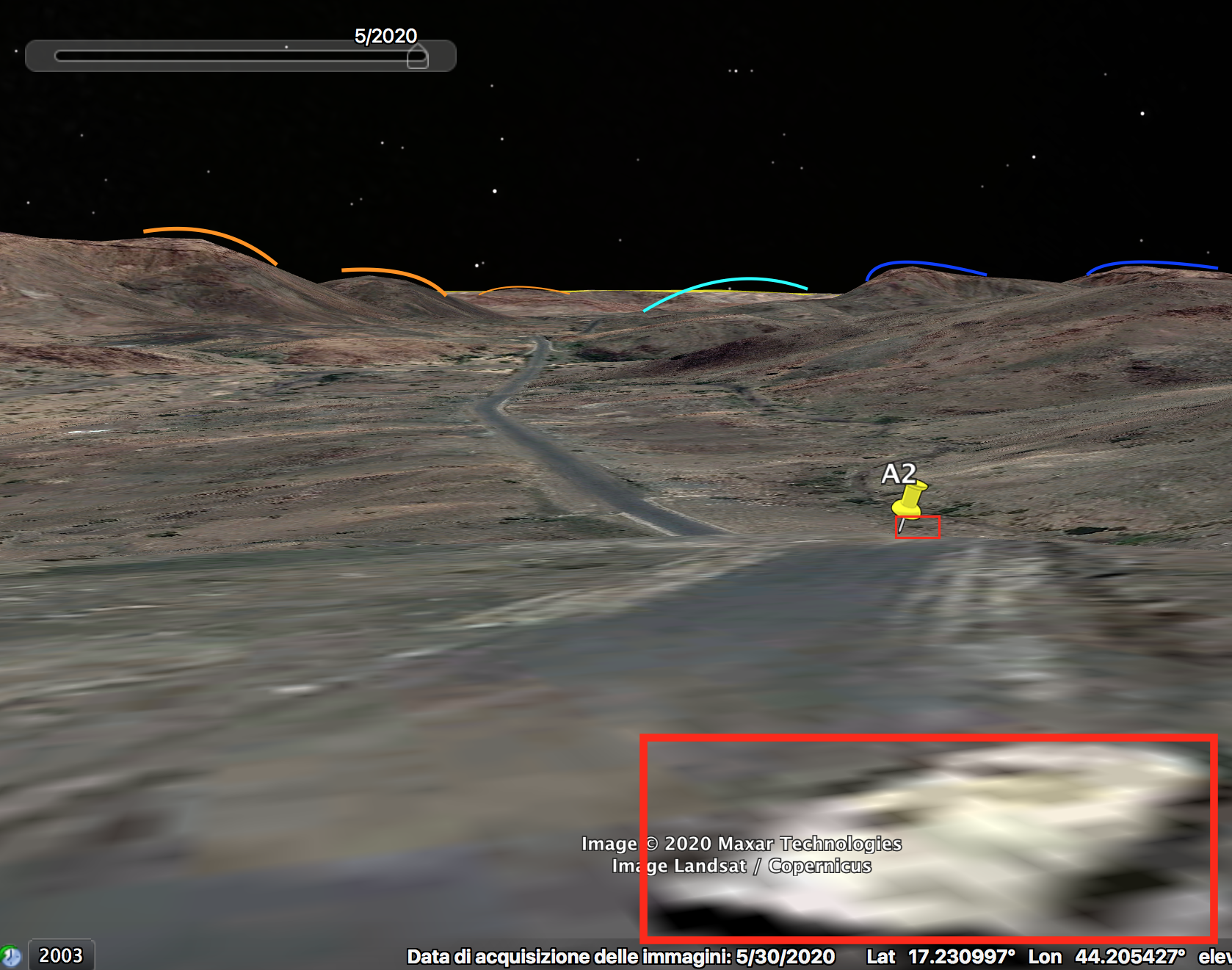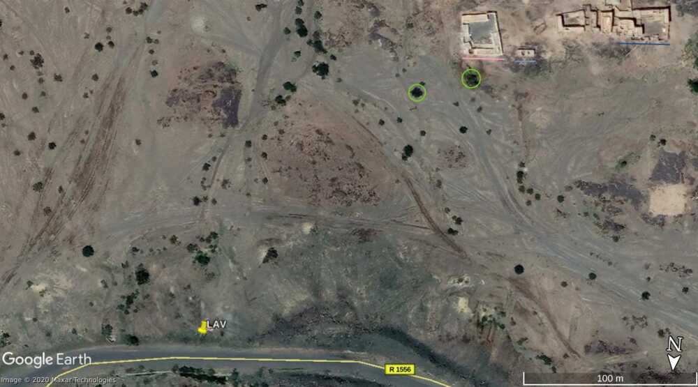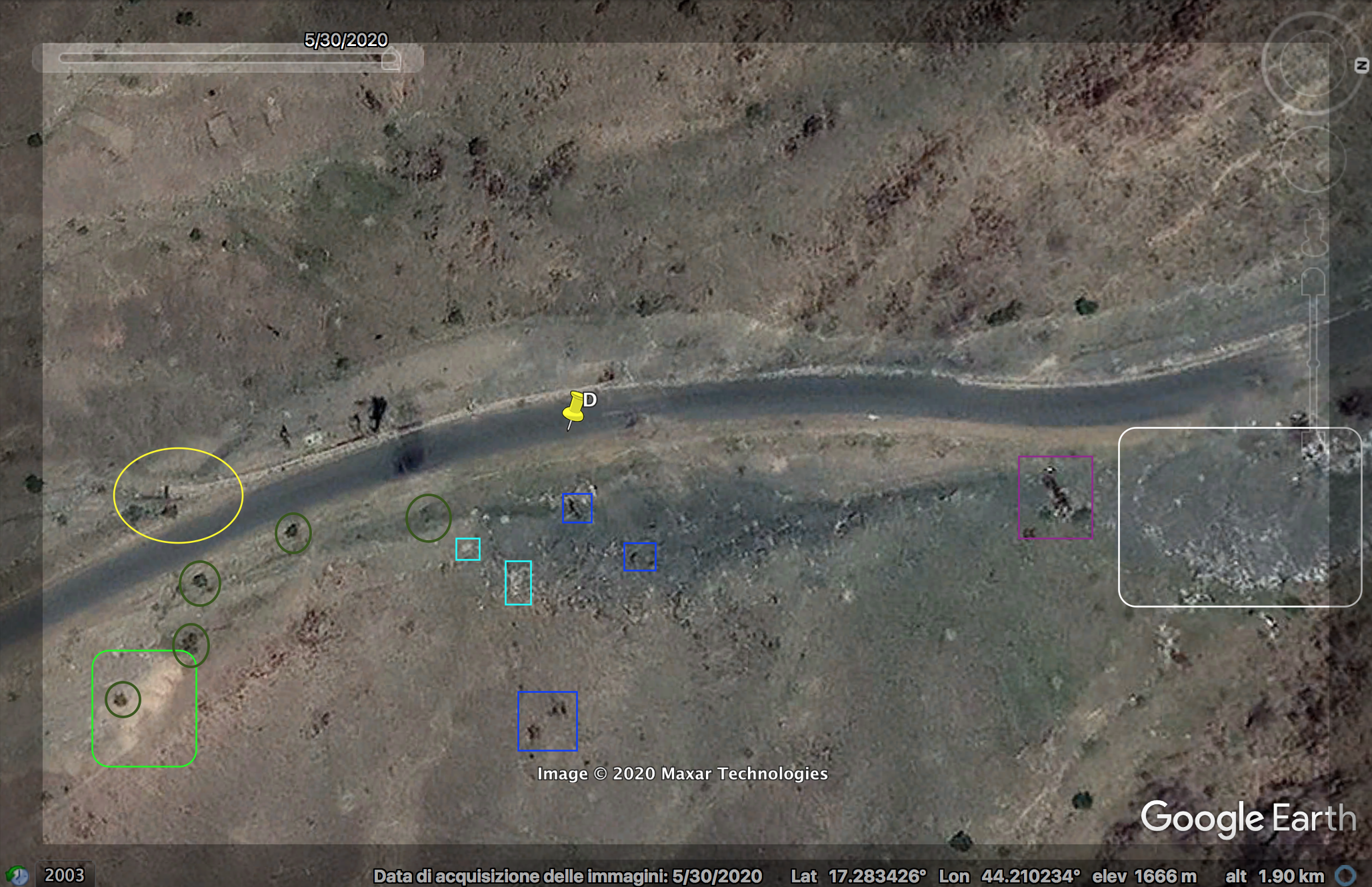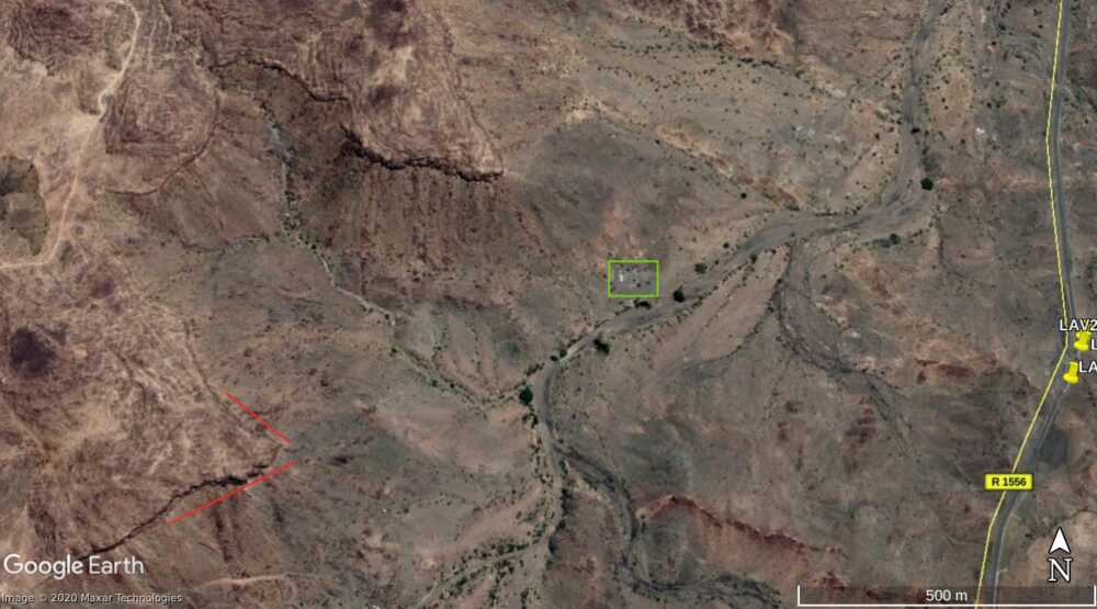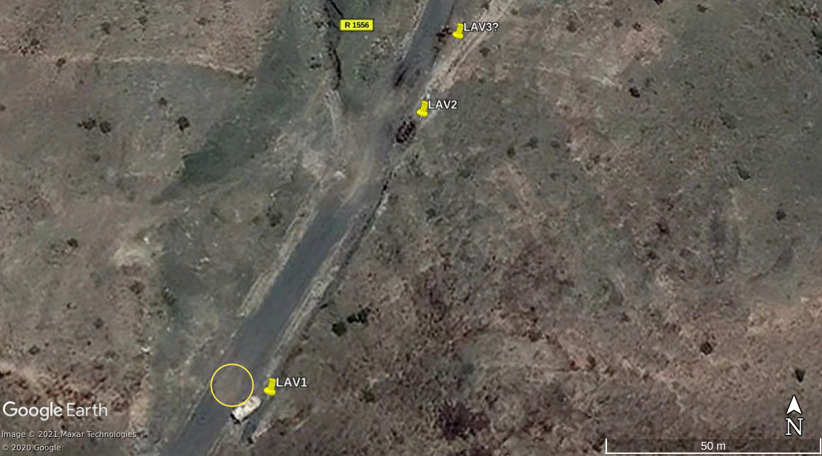 LAV1 en LAV2 zijn op de satellietbeelden nog steeds gepositioneerd zoals te zien is in de video. De LAV die over de weg gereden wordt om die te blokkeren, en vervolgens in brand wordt gestoken, is mogelijk aan de kant geschoven en zichtbaar als LAV3. Anderzijds is het voor dit laatste punt moeilijk om uit te maken of het inderdaad gaat om een uitgebrand wrak van een LAV. De 2 LAVs die op de video te zien zijn in de vallei naast de weg, kunnen niet meer teruggevonden worden op de satellietbeelden en zijn mogelijk verwijderd.Een eerste duidelijk detail is het gat (geel) in het asfalt nabij LAV1, terwijl ook de steile rotswand langs de oostelijke zijde van de weg overeenkomt.
