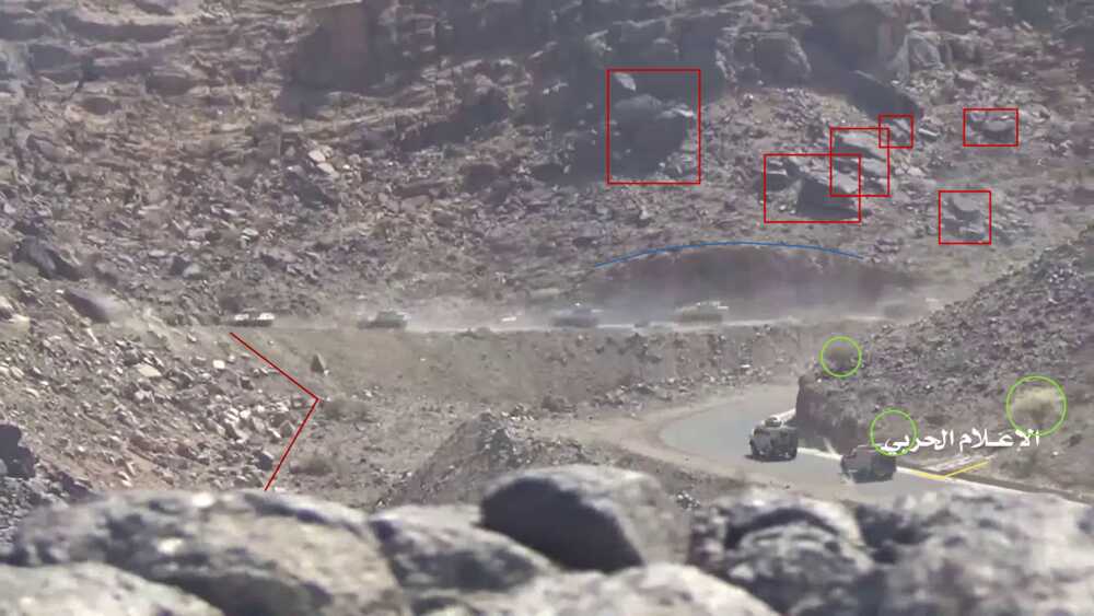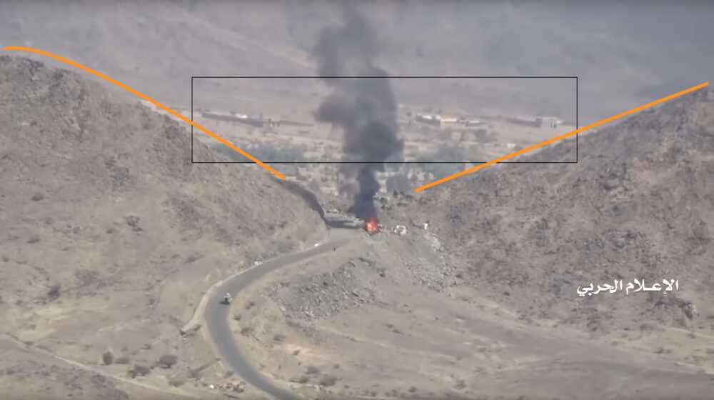 De Houthi reportage toont (van 20:08 tot 20:58) verschillende LAVs en andere voertuigen onder hoge snelheid naar het noorden rijden, terwijl ze onder vuur genomen worden. Deze video toont gelijkaardige scènes op andere punten, maar deze specifieke scène kan eenvoudig geverifieerd worden door de bijzondere vorm van de weg, een rechthoekige uitstulping langs de bergen. Verder komen verschillende visuele details overeen met de satellietbeelden.