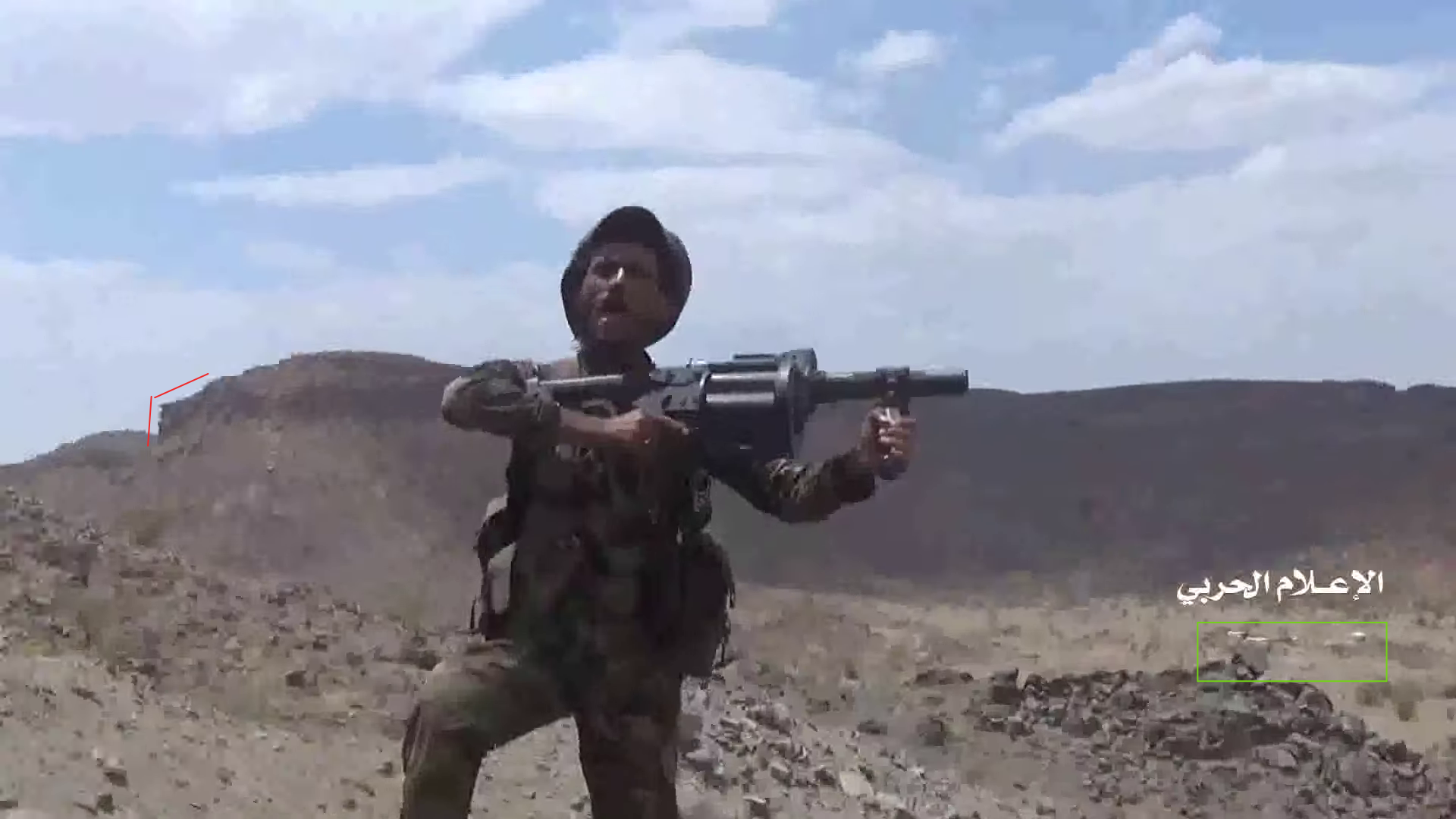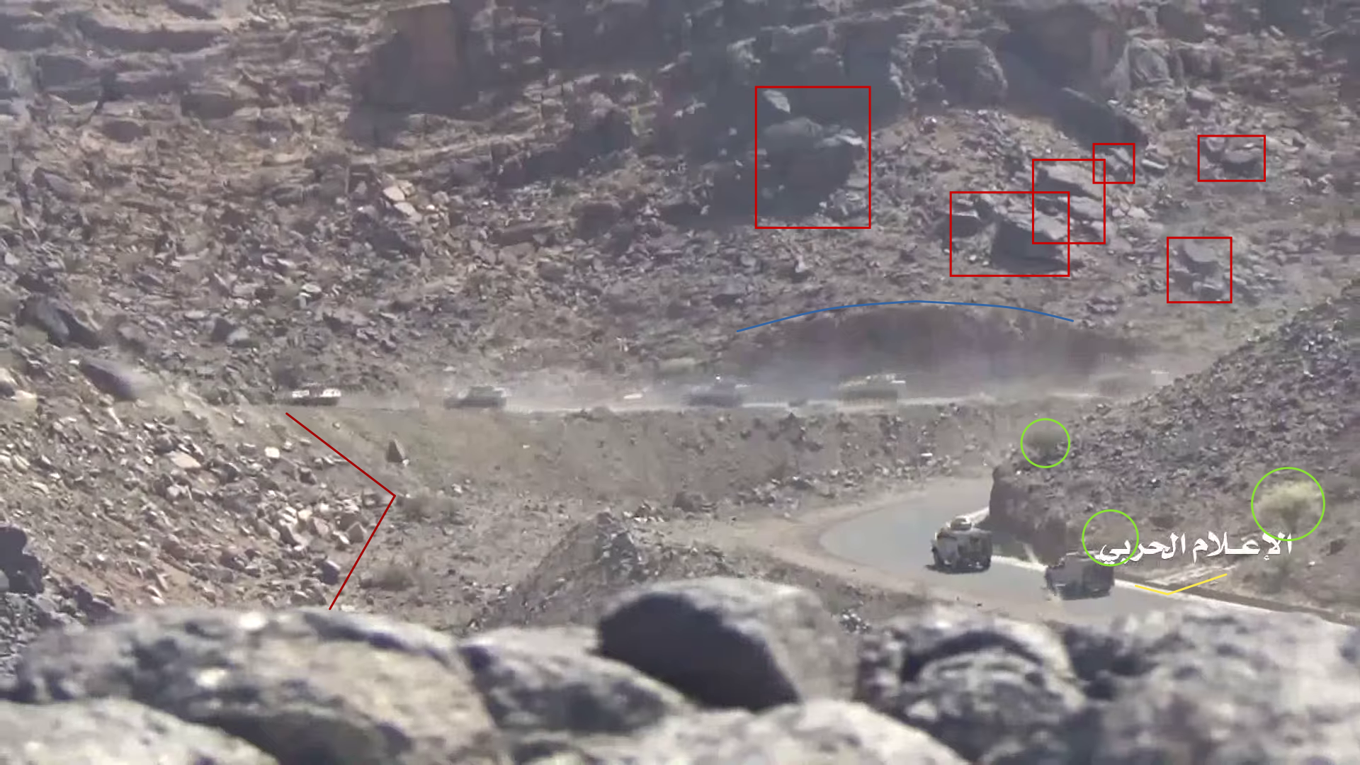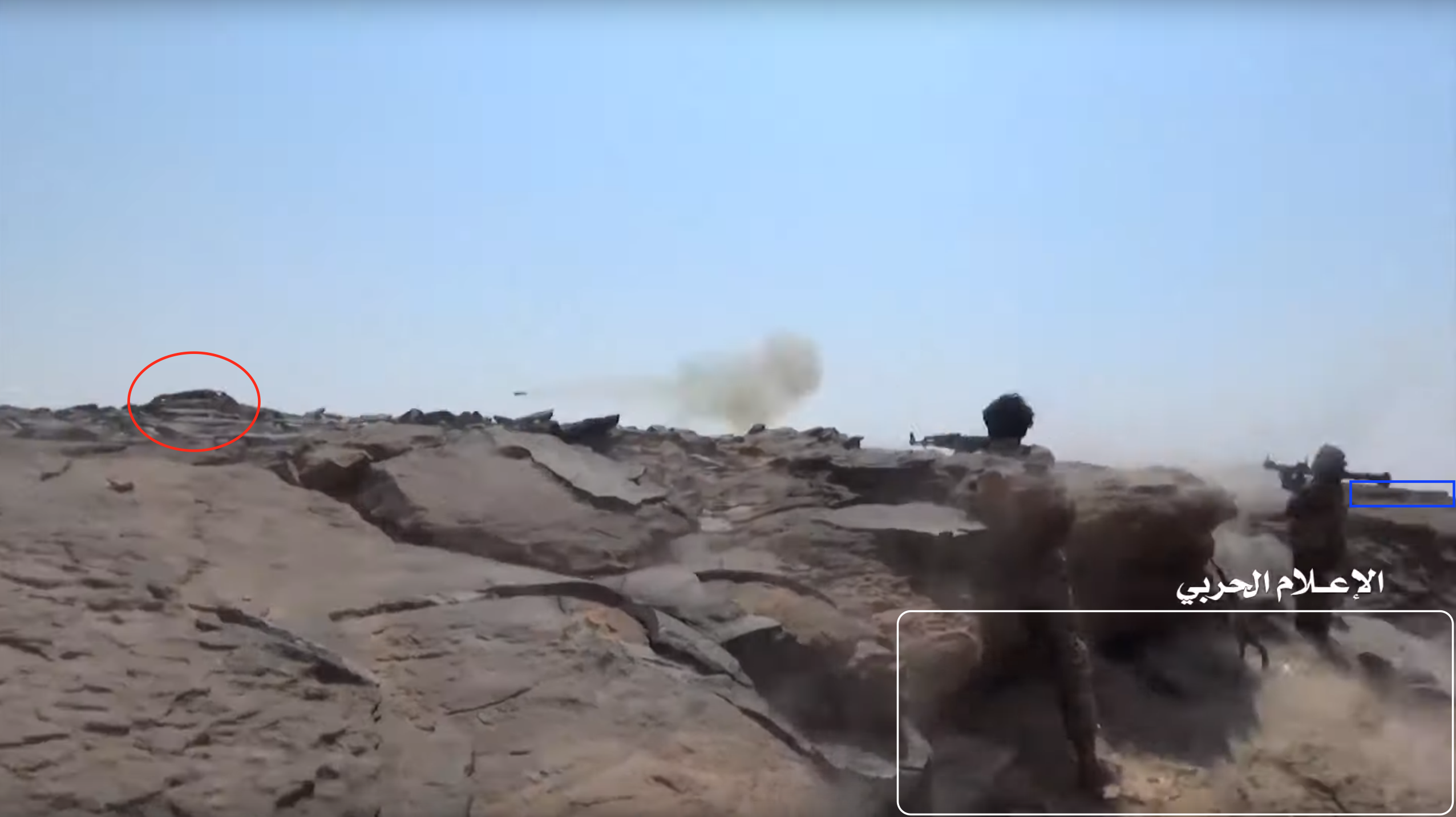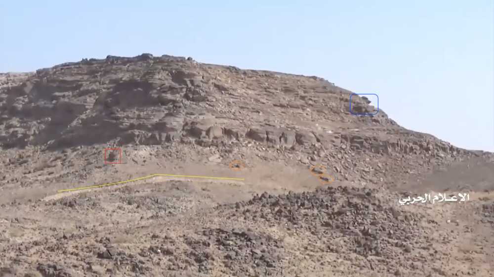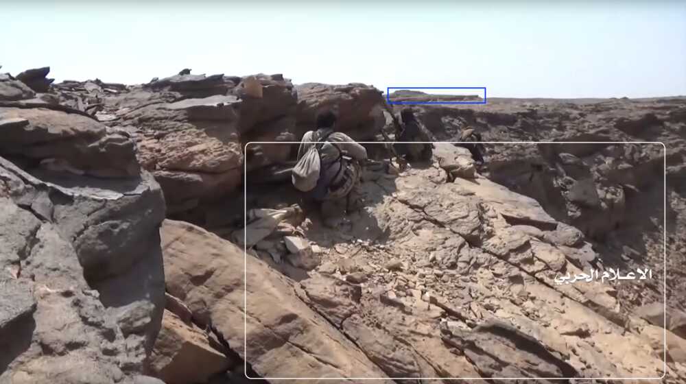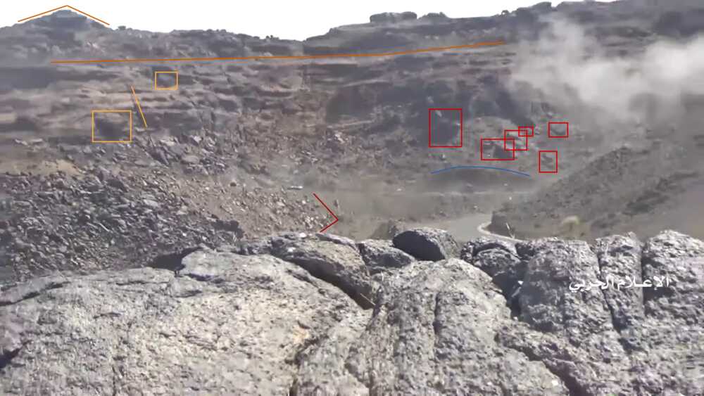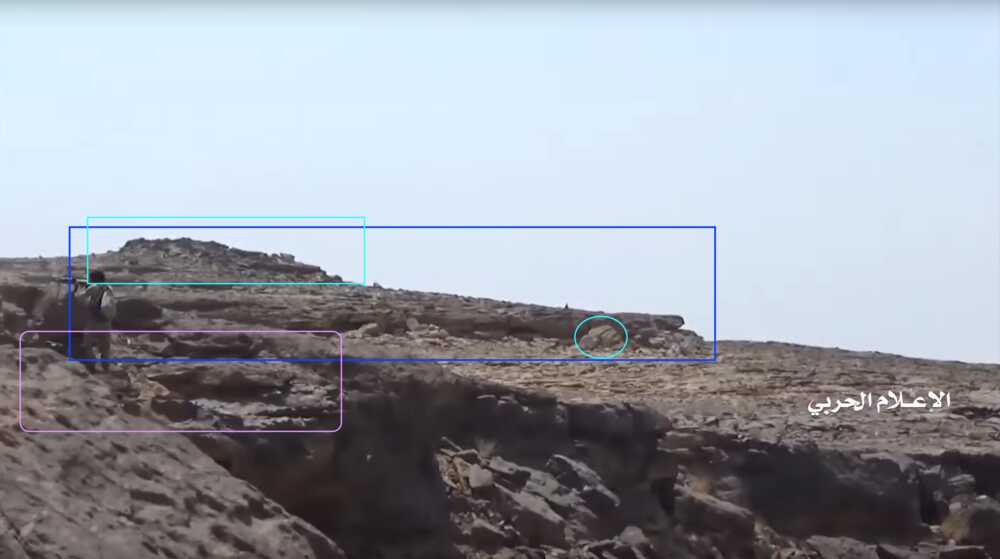 De video toont op 22:59 twee Jemenitische strijders schietend op de Saudische positie (rode cirkel). Zij staan op een vlak stenen platform (wit) dat uitsteekt van een zijkant van de plateauhelling. Het gebied wordt afgeschermd door een rotsblok, gebruikt als dekking. Aan de rechterzijde van de frame kan op een afstand een afgevlakte, licht boven de grond uitkomende, rotsformatie (blauw) onderscheiden worden.