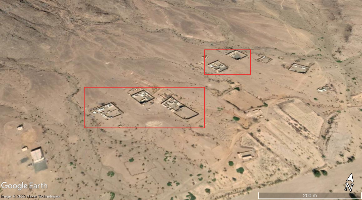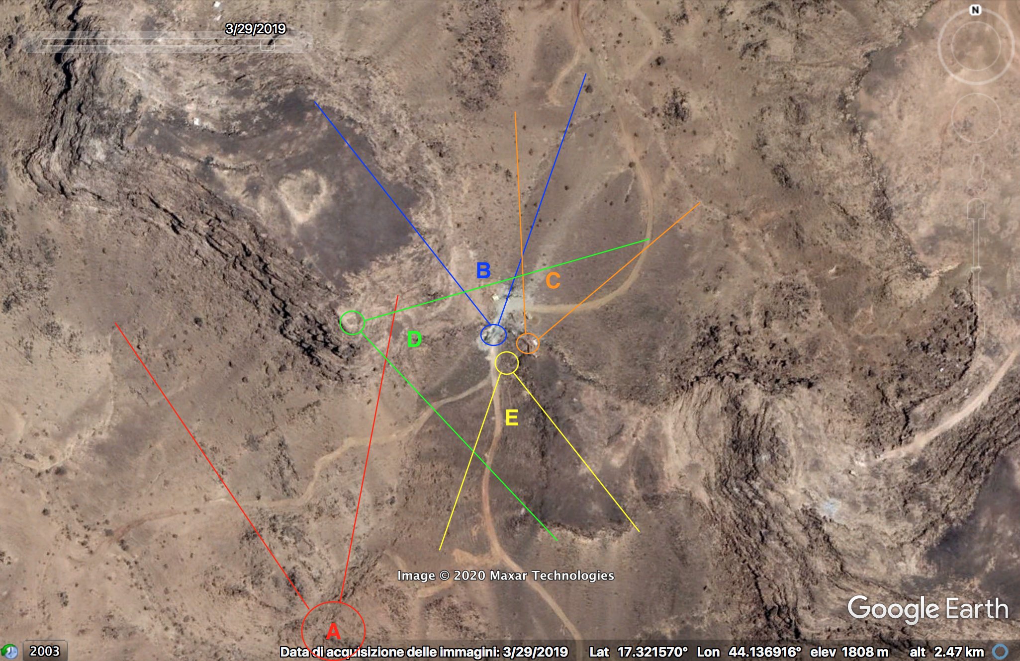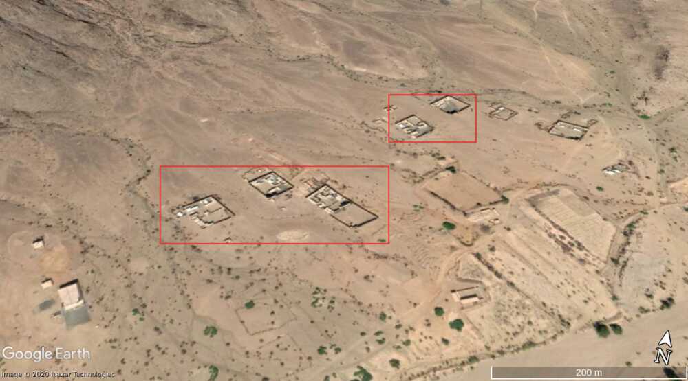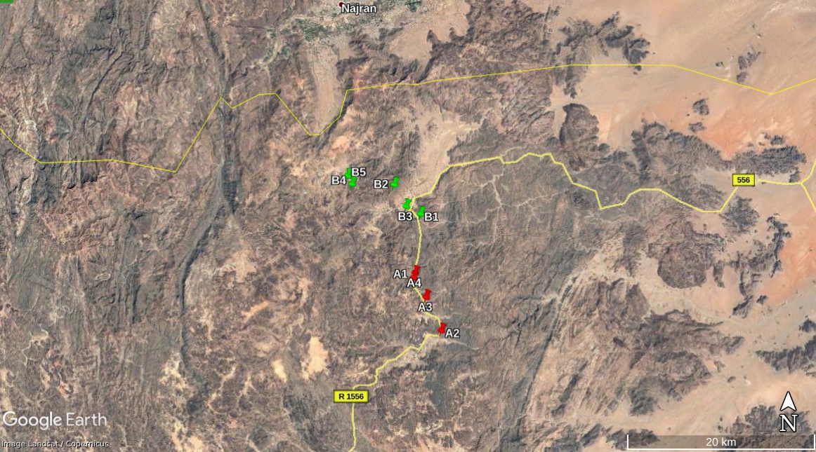 De video toont vijf verschillende perspectieven (A, B, C, D, E) opgenomen rond het zelfde gebied (de aangeduide lokaties zijn een benadering gebaseerd op de perspectieven in de video). De posities liggen aan een pas tussen 2 hellingen. Op satellietbeelden van maart 2019 zijn militaire voertuigen te zien nabij deze posities, wat een indicatie is dat deze als een permanent of regelmatig gebruikte bewakingspost gebruikt werd door de Saudische militairen. De Houthi beelden bevestigen deze veronderstelling. Ze tonen vlakbij ook een grote hoeveelheid van gebruikte munitieverpakkingen (B) en een munitiedepot (C).