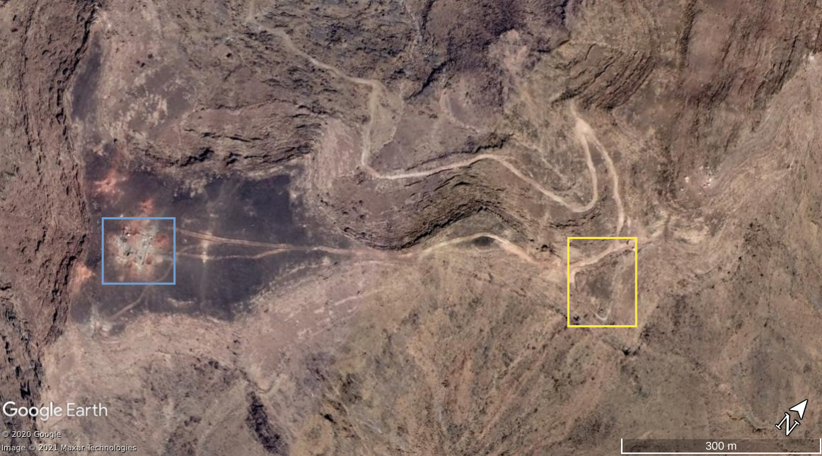 Op Google Maps is deze Saudi positie aangeduid als een benzinestation. De nabijgelegen bergen en hellingen (oranje) en de curve van de weg zichtbaar op de beelden gemaakt op deze positie komen overeen met de satellietbeelden.