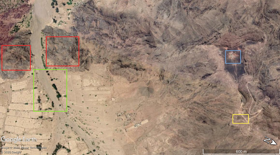 Een breder satellietbeeld toont alle tot nu toe geïdentificeerde elementen: de Saudische positie (rood), het grootste natuurlijke platform (wit), het tweede kleinere platform (paars), en de rotsformatie met heuvel en scherpe randen (blauw).