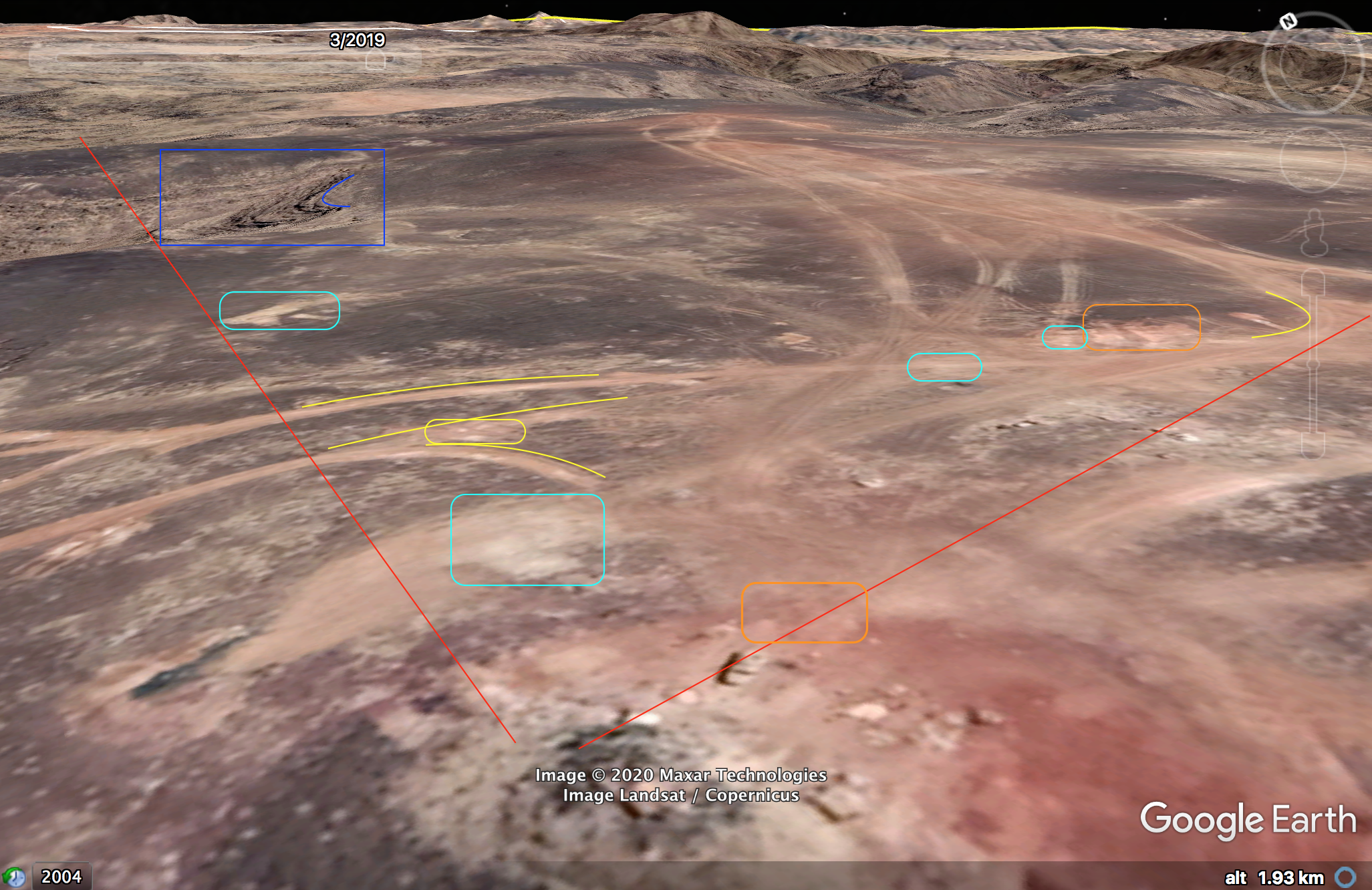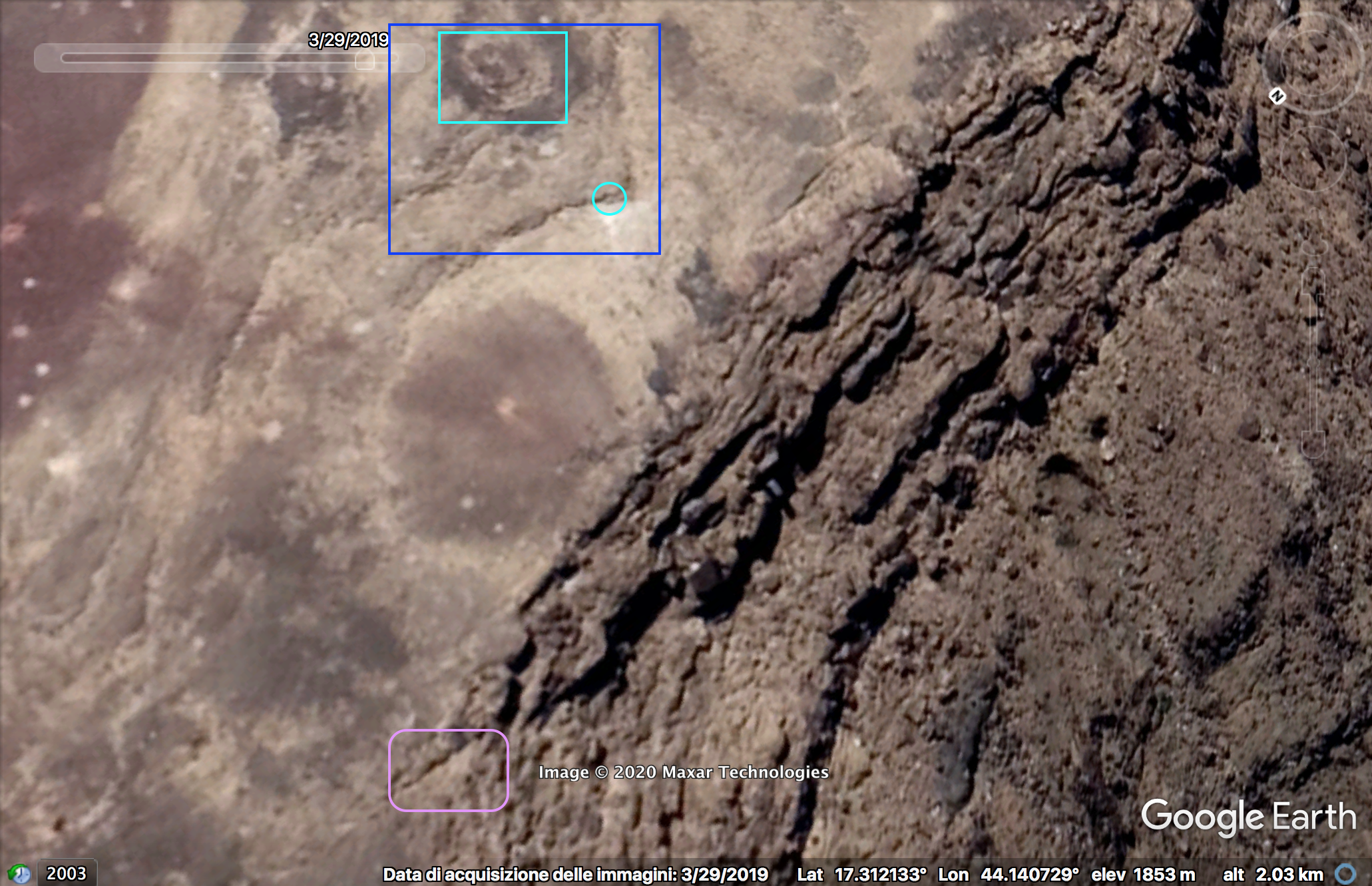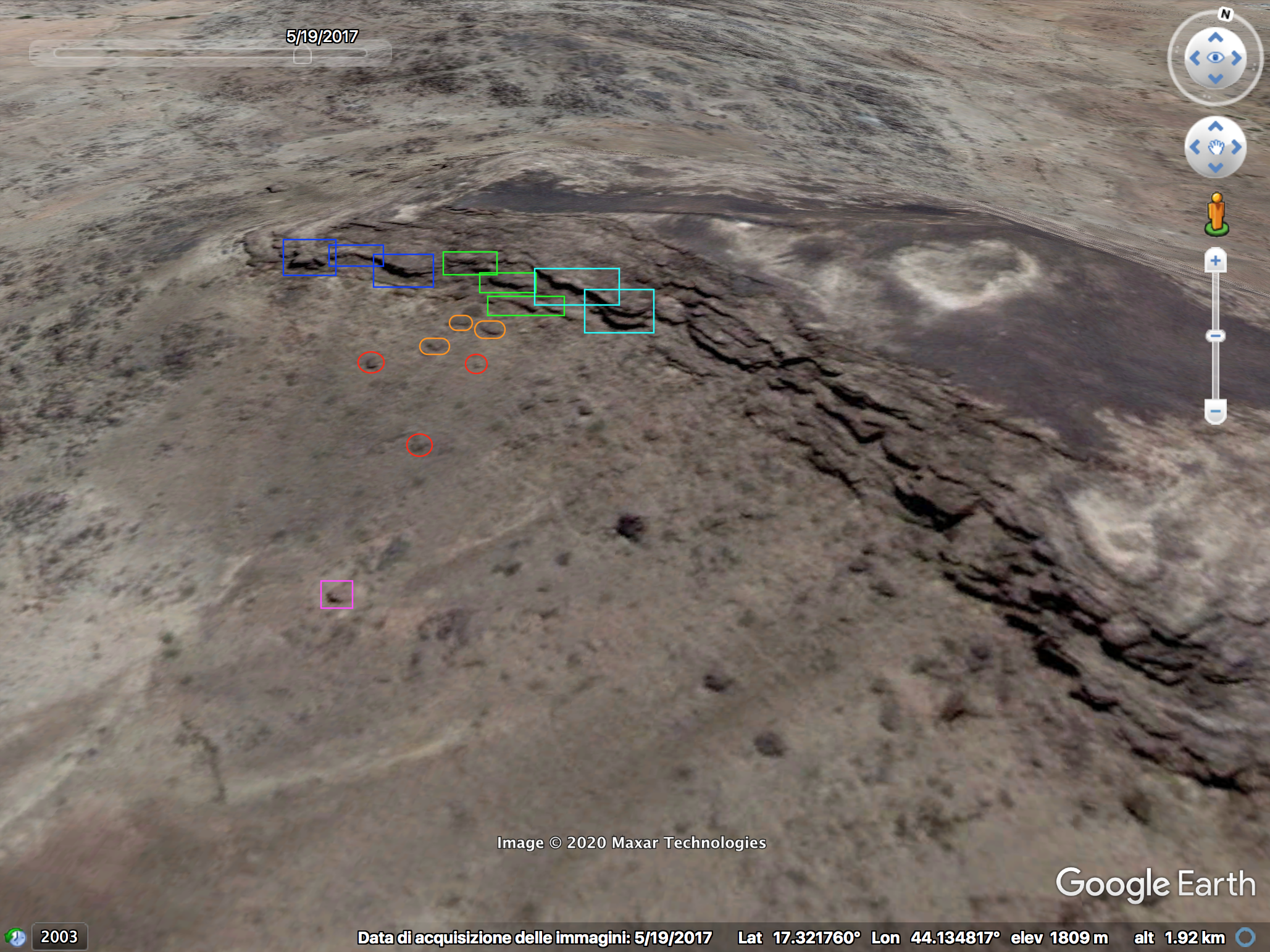 Twee bijkomende beelden die respectievelijk focussen op de linker- en rechterzijde van het oorspronkelijke beeld helpen bij de verdere verificatie van deze locatie. Op 32:33 – linkerzijde – zijn 3 verschillende patronen in de rotswand (blauw, groen, lichtblauw) en 2 patronen van elk 3 stenen geïdentificeerd die ook terug te vinden zijn op de satellietbeelden. De vierkante steen (roze) is gebruikt als referentie met het eerste beeld.
