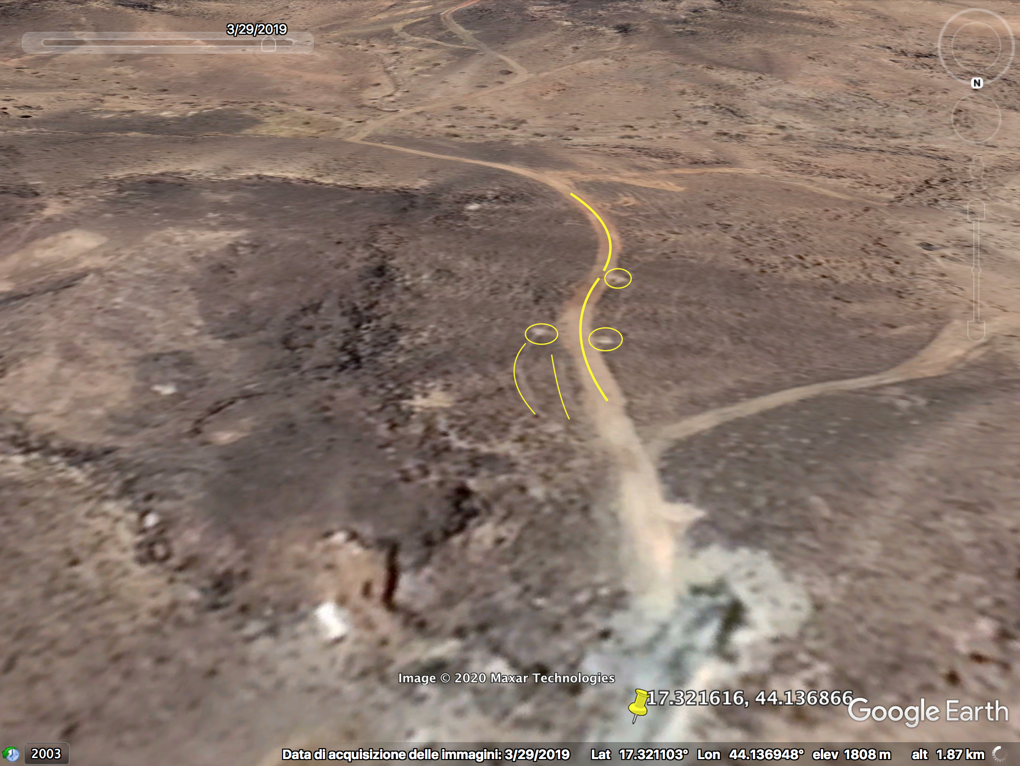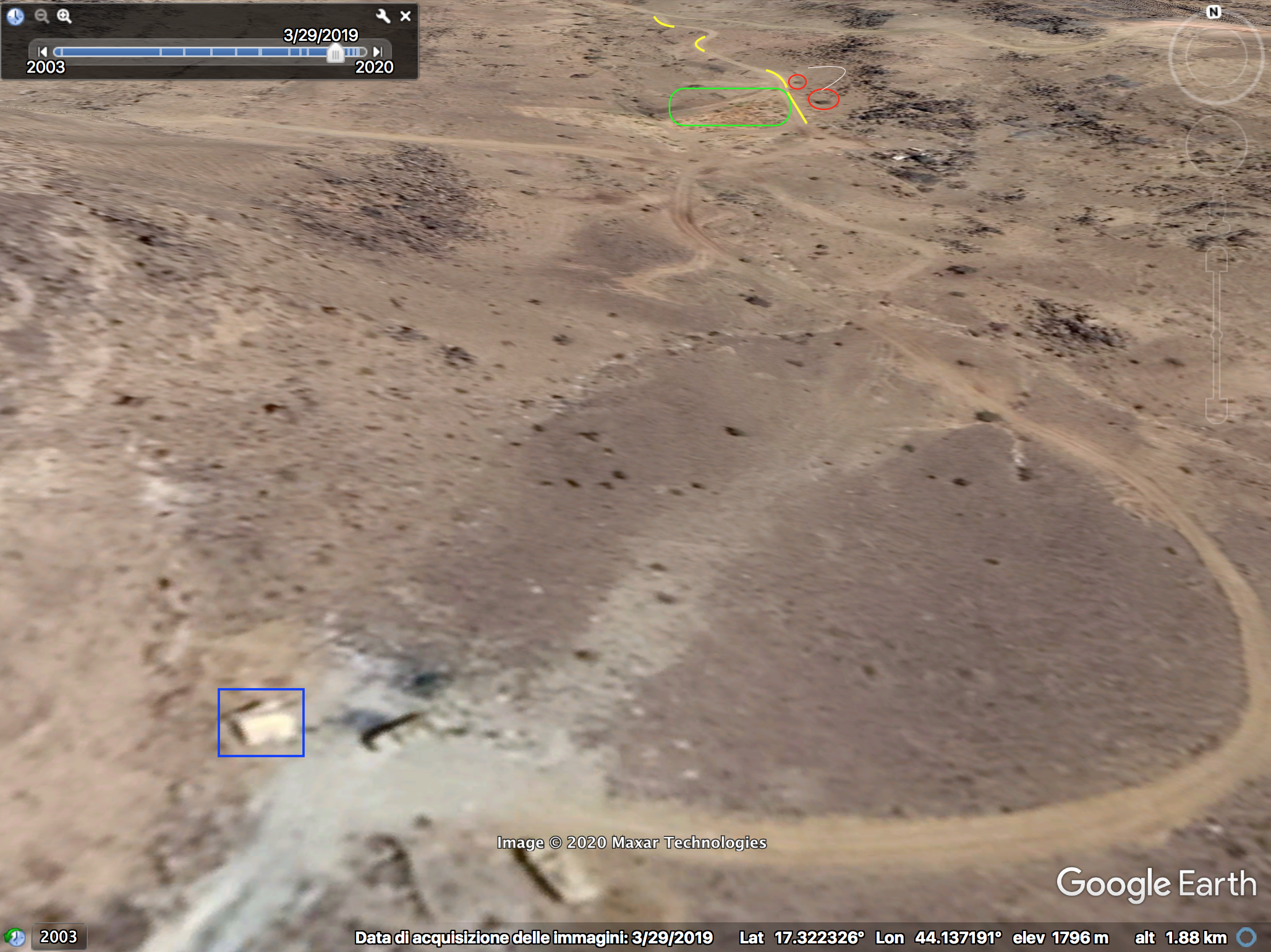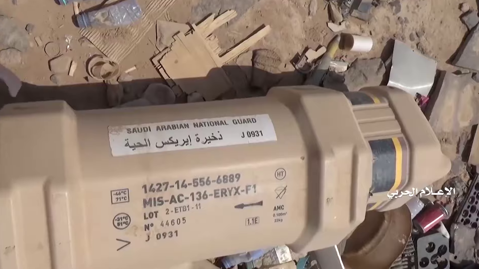Op 33:00 gaat de cameraman het Saudische munitiedepot binnen. Sommige elementen op de achtergrond kunnen onderscheiden worden in het bovenste deel van het beeld en geïdentificeerd worden in relatie met het lichtgekleurde voertuigspoor, dat een linksdraaiende kromme vormt: een kleine aardophoping (oranje), 2 kleine struiken (lichtblauw) gevolgd door 5 struiken (groen) in een specifiek patroon, een bleker gebied (wit) naast de weg en op dezelfde lijn als de struiken, en 3 rotsen (rood) zichtbaar op de satellietbeelden.
